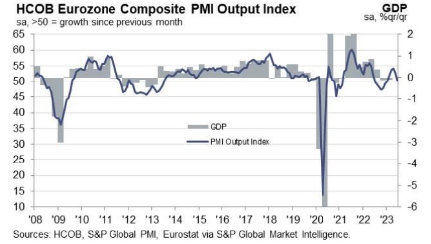 L'indice PMI composite pour l'ensemble de la zone euro est passé de 52,8 à 50,3, alors que le marché s'attendait à une légère baisse à 52,5 points. Cela signifie que l'indice PMI de la zone euro projette actuellement une croissance économique nulle et si la tendance continue à baisser, cela pourrait indiquer un risque de récession technique.