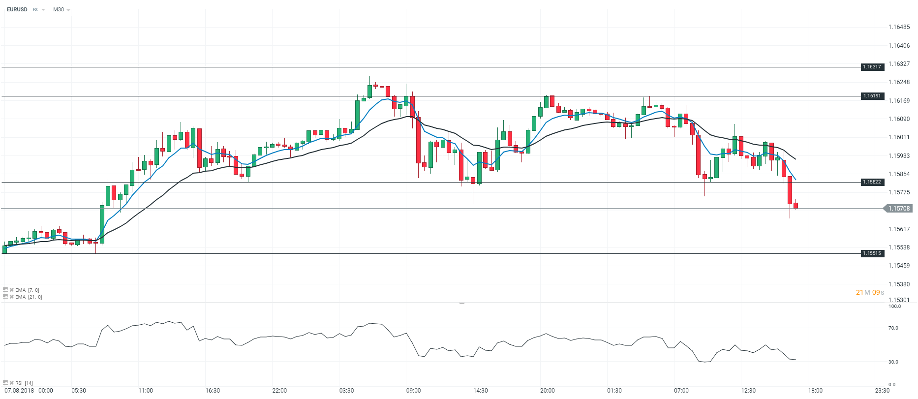 Aux Etats-Unis, l’indice des prix à la production a progressé de 3,3 % (en rythme annualisé) au mois de juillet. Dans le même temps, les inscriptions hebdomadaires au chômage ont diminué de 6 000 inscriptions à 213 000. Sur le volet des marchés d’actions, les opérateurs restent prudents en raison des craintes d’escalade commerciale entre la Chine et les Etats-Unis. D’un point de vue technique, la paire EURUSD est orientée à la baisse en unité de temps 30 minutes. Et pour cause, nous remarquons sur le graphique ci-dessus que les cours sont capés par les moyennes mobiles à 7 et 21 périodes. En outre, le RSI est baissier et devrait prochainement intégrer sa zone de survente. Pour conclure, nous avons un avis vendeur sur la paire et estimons qu’elle pourrait retrouver le niveau des 1,1550, voire 1,1535 $ pour 1 € à court terme.