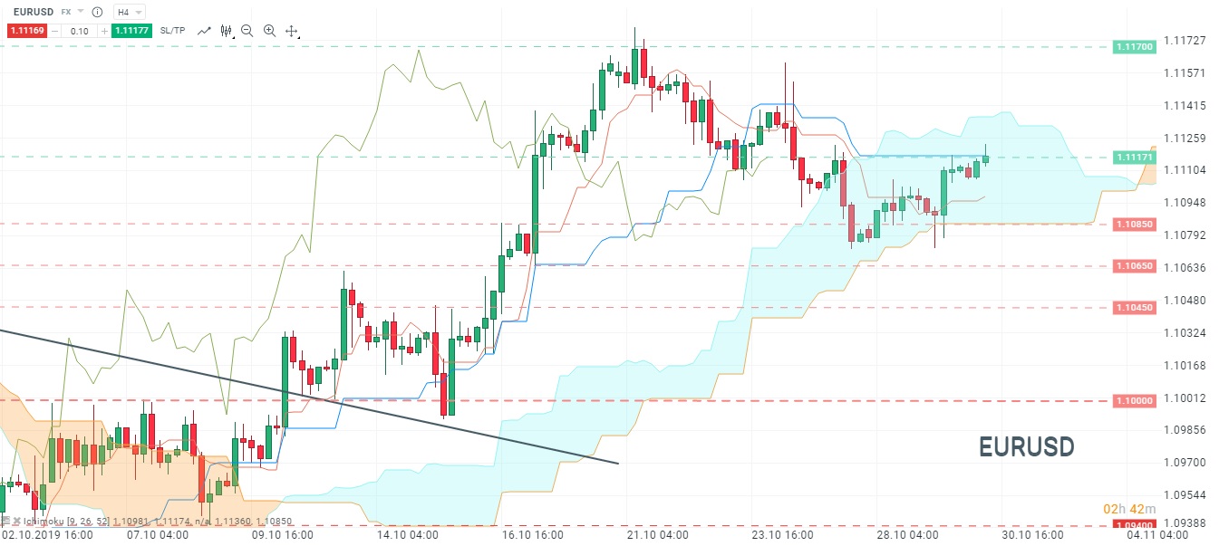 Sur le marché des changes, cette séance sera cruciale pour le dollar américain, qui sera soumis à la décision de la Fed. Si la Fed ne sous-entend aucune prochaine baisse de taux en décembre ou en janvier, le dollar pourrait se renforcer considérablement et renvoyer la paire EURUSD en direction de sa SSB à 1,10850$, nous donnant par la même occasion un signal de vente. L’EURUSD pourrait se replier vers les 1,10450$, ce qui d’un point de vue technique, suggèrerait une poursuite de la baisse. En revanche, un discours accommodant de la part de Jerome Powell permettrait à la paire EURUSD de s’affranchir de sa Kijun H4 en sortant de son nuage en direction des 1,1170$