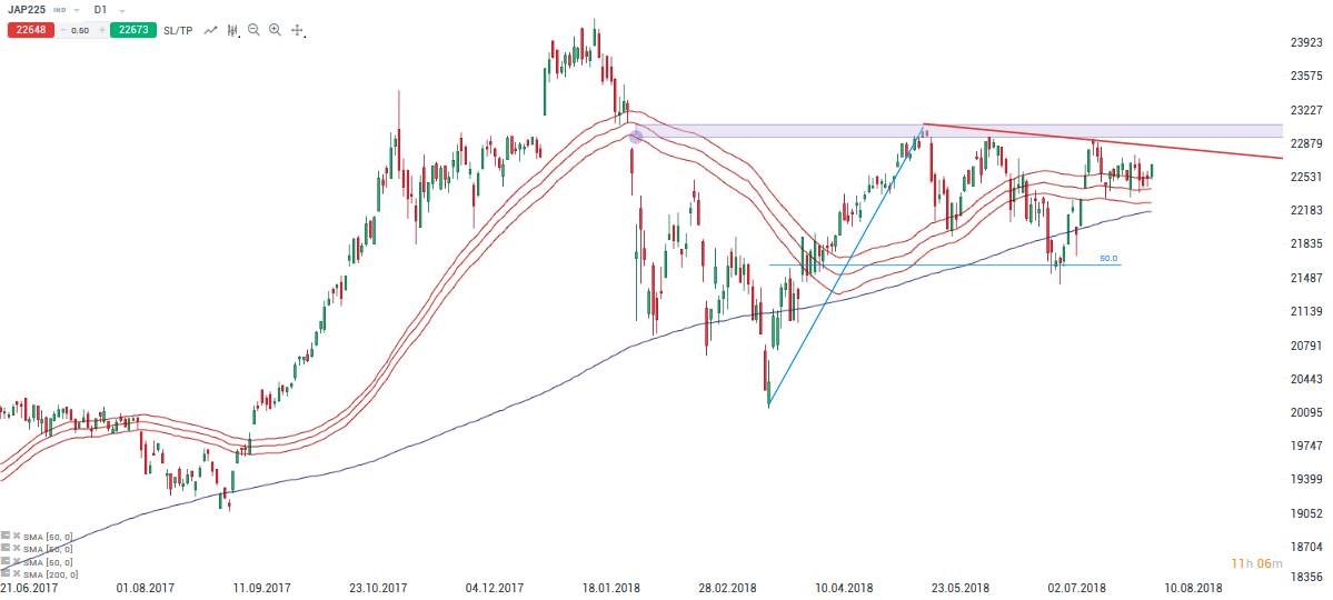Les indices américains continuent de progresser vers des sommets historiques. En parallèle, l’indice japonais Nikkei 225 (JAP225) consolide dans un range depuis le printemps 2018. Cependant, la zone de consolidation s’est récemment rétrécie. L’indice fluctue près d’une résistance située au niveau des 23 000 points. De plus, les cours se rapprochent des moyennes mobiles à 50 et 200 périodes. Le franchissement des moyennes mobiles pourrait nous donner un signal haussier. De même, la rupture d’une ligne reliant les sommets des mois de mai, juin et juillet pourrait être interprété comme un signal. Néanmoins, le seuil psychologique des 23 000 points reste d’actualité. Une hausse continue de la paire USDJPY pourrait soutenir l’indice. Or, les dernières tendances sur le dollar et l’amélioration de la croissance des salaires au Japon (qui pourrait justifier un biais plus « hawkish » de la part de la Banque du Japon) pourraient remettre en cause ce scénario.