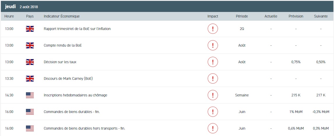 La séance du jour sera marquée par la décision de politique monétaire de la Banque d’Angleterre (BoE) attendue à 13h00. Concernant les marchés, Wall Street a clôturé en ordre dispersé en raison du retour des tensions commerciales entre la Chine et les Etats-Unis. Seul le Nasdaq a terminé dans le vert grâce à Apple. Le géant américain a gagné près de 6% et atteint un nouveau record en séance à 201,76 dollars. Sa capitalisation boursière se rapproche donc du seuil symbolique des 1 000 milliards de dollars. Le secteur technologique a progressé en conséquence. En revanche, les valeurs énergétiques souffrent du contexte commercial. En Europe, les indices ont reculé sur fond d’inquiétudes sur les droits de douane. Le secteur automobile a enregistré la plus forte baisse, de même que les ressources de base. Enfin, le Nikkei 225 a terminé en baisse de 1,03% au niveau des 22 512 points en raison du renforcement du yen et de mauvais résultats d’entreprises.