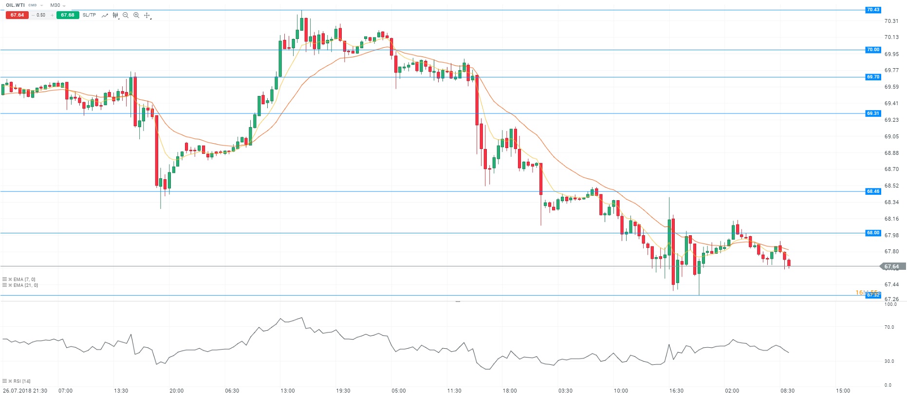 Sur le plan des matières premières, le contrat WTI a terminé mercredi en baisse de 1,60% au niveau des 67,66 dollars le baril. Ce repli est dû à la hausse inattendue des stocks de brut américain. En effet, le département américain de l’Energie a fait état d’une augmentation des stocks de brut de 3,8 millions de barils pour la semaine terminée au 27 juillet. Le consensus anticipait une baisse de 2,7 millions de barils. Par ailleurs, les stocks d’essence ont diminué de 2,5 millions de barils tandis que ceux de produits distillés ont progressé de 2,8 millions de barils. La hausse de la production de l’OPEP et les tensions commerciales pèsent également sur la tendance. D’un point de vue technique, les prix évoluent sous les moyennes mobiles (à 7 et 21 périodes) en unité de temps M30. Le RSI est orienté à la baisse autour de sa zone de neutralité. En conclusion, nous avons un biais vendeur avec comme objectif le niveau des 67,32 dollars le baril.