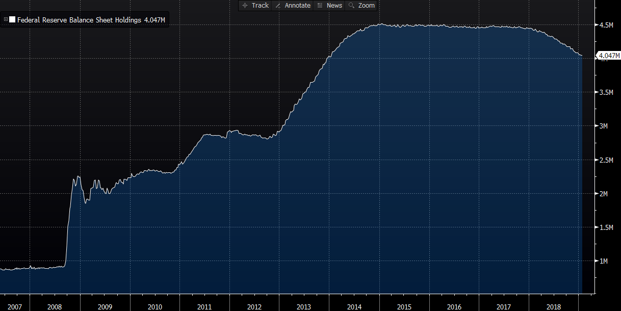 Les États-Unis ne font pas exception à la règle. Et pour cause, le pays est impacté par la diminution des réductions d’impôts et les pertes causées par la guerre commerciale avec la Chine. Cela dit, il ne serait pas prudent de s’attendre à ce que la Fed déclare que les taux ne seront pas augmentés en 2019. Dans le même temps, la Fed continue de réduire son bilan au rythme de 50 milliards de dollars par mois (ce qu'on appelle un QE inversé).