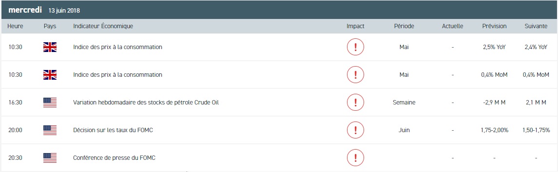 La séance du jour sera bien évidement marquée par la décision de la Fed concernant les taux d’intérêt. Wall Street a clôturé mardi en léger territoire positif. La prudence reste de mise avant la décision de politique monétaire de la Réserve fédérale. Le rapprochement entre Donald Trump et Kim Jong-un n’a pas eu d’impact majeur sur les marchés. Seules les valeurs du secteur de la défense ont été pénalisées. Par ailleurs, Twitter et Tesla se sont distingués tandis que AT&T a obtenu gain de cause devant la justice américaine pour le rachat de Time Warner. En Europe, les indices ont terminé en léger repli en attendant les décisions de politique monétaire. Cet attentisme n’a pas pesé sur l’euro et les rendements obligataires. Sur la cote parisienne, Carrefour s’est signalé alors que Michelin est pénalisé par le coût des matières premières. Du côté de l’Asie, le Nikkei 225 a fini en hausse de 0,38% sur le niveau des 22 966 points grâce à Toshiba.