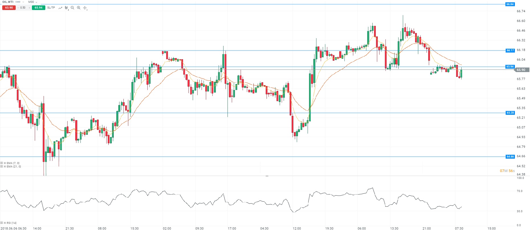 Sur le plan des matières premières, le contrat WTI a terminé en hausse de 0,39% au niveau des 66,36 dollars le baril. Aux Etats-Unis, l’American Petroleum Institute a fait état d’une hausse surprise des stocks de pétrole de 833 000 barils pour la semaine terminée au 8 juin. Par ailleurs, nous avons pris connaissance du rapport mensuel de l’OPEP. Le cartel a fait part de son incertitude concernant les perspectives au second semestre sur les marchés pétroliers. De plus, il semblerait que la révision de l’accord de restriction de la production ne soit pas au programme de la réunion prévue les 22 et 23 juin prochains. D’un point de vue technique, les prix évoluent autour des moyennes mobiles (à 7 et 21 périodes) en unité de temps M30. Le RSI est orienté à la hausse vers sa zone de neutralité. En conclusion, nous avons un biais acheteur avec comme objectif le niveau des 66,17 dollars le baril.