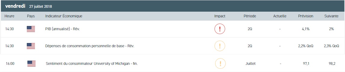 La séance sera marquée par la publication de la première estimation du PIB pour le second trimestre aux Etats-Unis. Du côté des marchés, Wall Street a clôturé en ordre dispersé jeudi en raison de la chute historique de Facebook entrainant avec lui le Nasdaq et les autres valeurs technologiques. Le géant américain a perdu près de 20%, une première en six ans de cotation. A l’opposé, le secteur industriel profite de la relative accalmie sur le plan commercial. En Europe, l’effet bénéfique de l’accord commercial entre l’Union européenne (UE) et les Etats-Unis a permis aux indices de terminé en hausse. Le secteur automobile s’est distingué en l’absence de mesures tarifaires immédiates. Enfin, du côté de l’Asie, le Nikkei 225 a fini en hausse de 0,56% au niveau des 22 712 points grâce au rapprochement commercial entre l’UE et les Etats-Unis. Cependant, la prudence était de rigueur avant la réunion de politique monétaire de la Banque du Japon prévue la semaine prochaine.