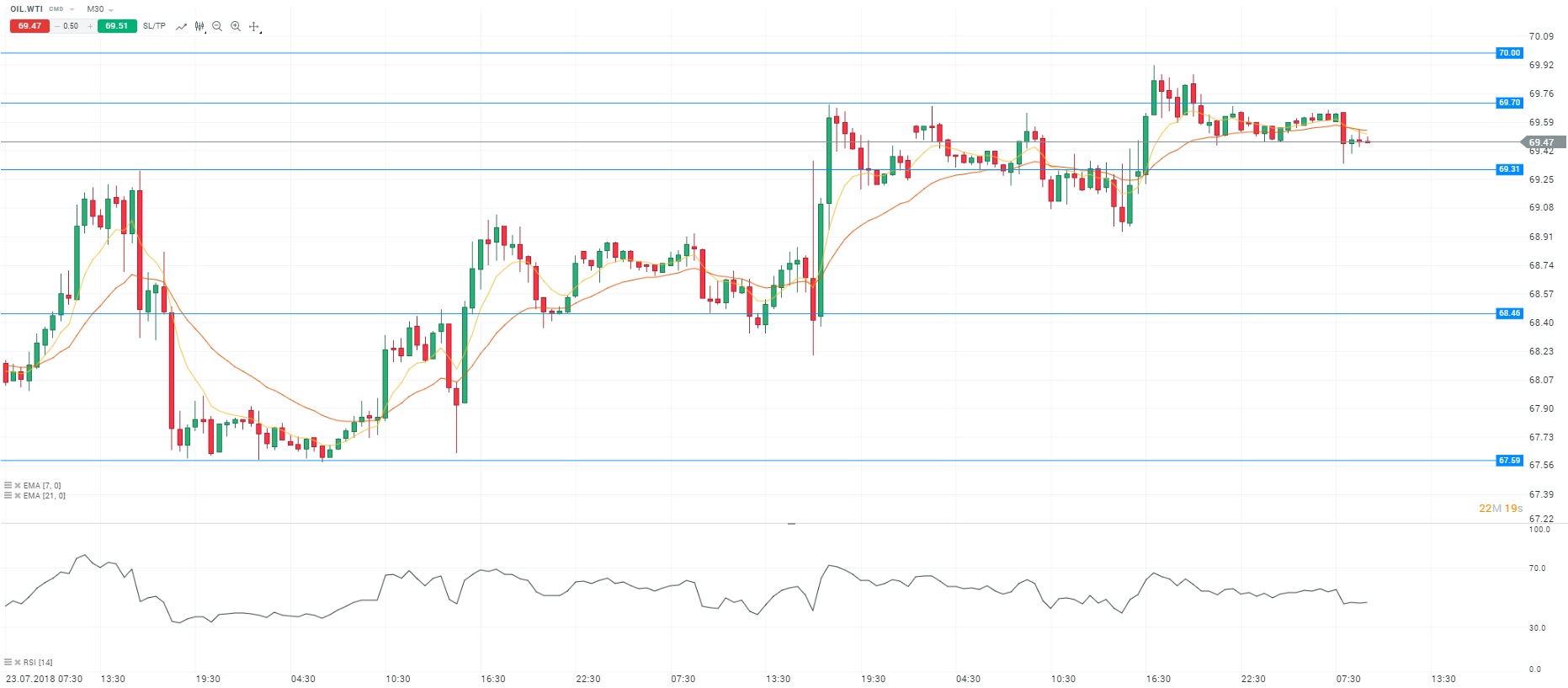 Sur le plan des matières premières, le contrat WTI a terminé jeudi en hausse de 0,45% au niveau des 69,61 dollars le baril. La détente sur le plan commercial entre l’Union européenne et les Etats-Unis soutient les cours. Pour rappel, aucune taxe ne sera appliquée sur les importations de véhicules européens sur le sol américain le temps des négociations. De plus, les publications faisant état d’une baisse des stocks de pétrole renforcent cette tendance. D’un point de vue technique, les prix évoluent sous les moyennes mobiles (à 7 et 21 périodes) en unité de temps M30. Le RSI est stable autour de sa zone de neutralité. En conclusion, nous avons un biais acheteur avec comme objectif le niveau des 69,70 dollars le baril.