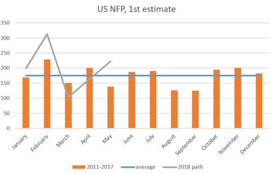 Le consensus ne remet pas en doute l’idée que le marché du travail est solide aux Etats-Unis. En effet, au cours des 12 derniers mois, le nombre moyen d’emplois créés s’est établi à 197 000 soit juste en dessous du seuil des 200 000 créations constaté sur une période antérieure. Avec un taux de chômage qui se stabilise sous le niveau des 4%, la croissance de l’emploi devrait ralentir. Cette situation symbolise la vigueur de l’économie américaine. Il n’y a donc aucune raison pour que l’on ait une nouvelle croissance de l’emploi de 200 000. Par ailleurs, le mois de juin devrait s’inscrire dans la moyenne, comparé aux périodes de 2011-2017 et de 2001-2017.