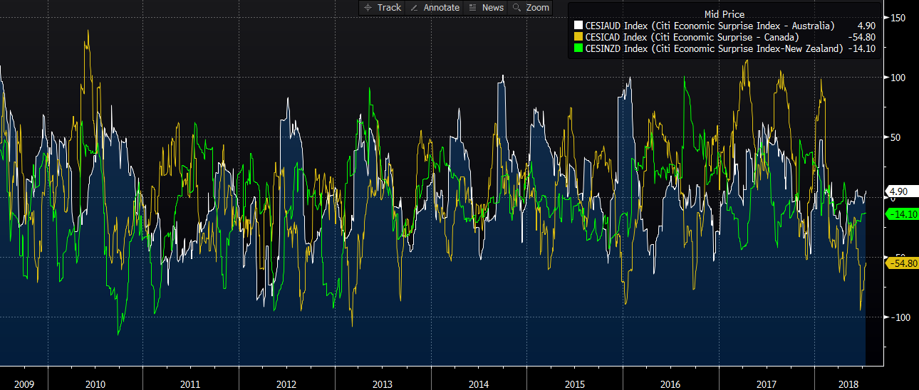 Comme évoqué précédemment, la sous-performance observée sur ces monnaies est liée aux tensions commerciales. En effet, l’AUD et le NZD sont exposés de manière significative au commerce chinois alors que le CAD a un lien commercial fort avec les Etats-Unis. En revanche, le conflit commercial n’est pas la seule explication. En outre, les données macro-économiques domestiques sont ressorties inférieures aux attentes du consensus. Sur le graphique ci-dessus, nous observons que l’indice de surprise économique canadien s’est fortement replié récemment, atteignant son point le plus bas depuis le premier trimestre de 2013. En Nouvelle-Zélande, l’indicateur évolue également sur des plus bas. Du côté de l’Australie, l’indice est mieux orienté. Ces données nous indiquent que la probabilité d’une nouvelle baisse semble limitée.