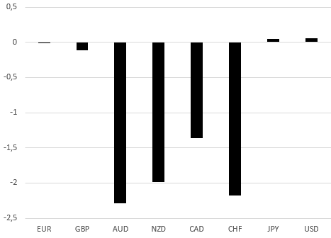 Le rythme hebdomadaire de publication des données de la CFTC explique en partie la tendance observée. La dernière publication suggère que le dollar australien s’est éloigné de plus de deux écarts-types de sa moyenne mobile à deux ans. La tendance est similaire pour le dollar néo-zélandais et le dollar canadien. Bien entendu, même si les données de la CFTC indiquent qu’un rebond pourrait intervenir prochainement, cela ne garantit pas une inversion de tendance. Or, le graphique ci-dessus nous montre qu’une amplification du mouvement pourrait être contenue sur ces trois monnaies.