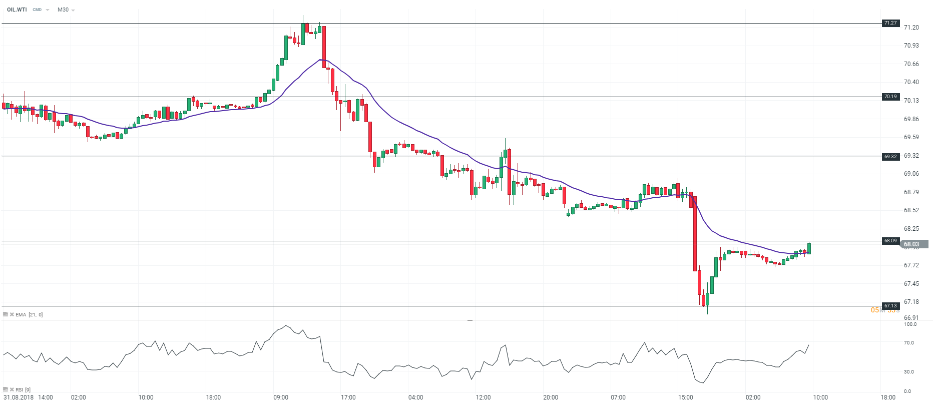 D’après le département de l’Energie américain (DoE), les stocks de brut se sont contractés de 4,3 millions de barils la semaine dernière. Les stocks totaux sont estimés à 400 millions de barils, soit un plus bas de février 2015. Toutefois, les stocks d’essence et de produits distillés ont respectivement augmenté de 1,8 et 3,1 millions de barils. Dans ce contexte, le contrat WTI a terminé jeudi en baisse de 1,38 % à 67,77 dollars le baril. D’un point de vue technique, nous conservons un biais positif sur le contrat WTI en raison du repli du dollar US et des perspectives de consommation de carburant aux Etats-Unis.