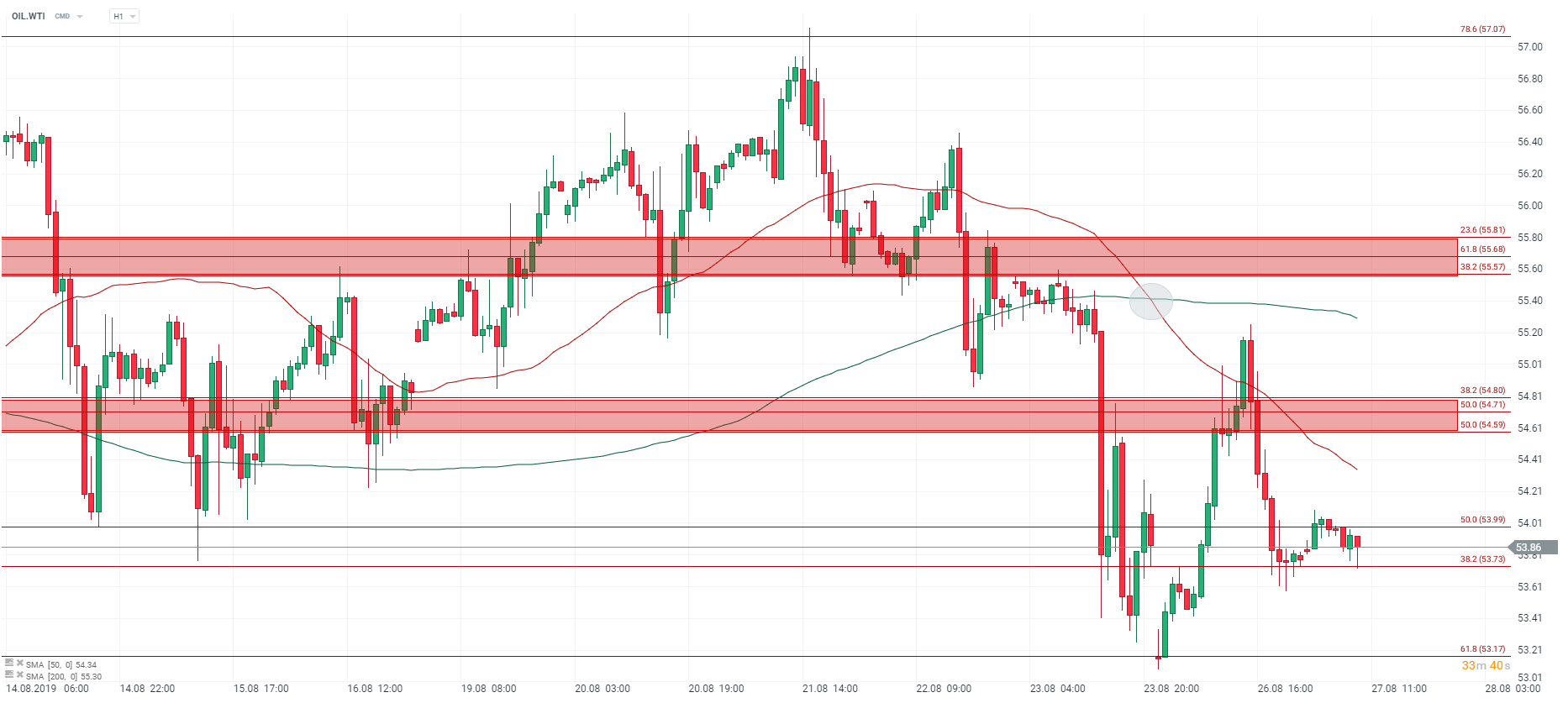 Nous prendrons connaissance ce soir à 22h30 de la variation des stocks hebdomadaire de pétrole aux Etats-Unis pour la semaine terminée au 23 août selon l’American Petroleum Institute. Selon cinq analystes interrogés par Reuters, ces derniers ont estimés que les stocks de pétrole brut avaient chuté de 2.1 millions de barils au cours de la semaine terminée le 23 août. Les prix du pétrole sont toujours sous pression, notamment suite à l’annonce vendredi dernier de nouveaux droits de douanes chinois à hauteur de 5 % (à compter du 1er septembre puis 10 % à compter du 15 décembre) sur les importations de pétrole américain. Pour l’heure, les cours WTI évoluent au-dessus de leur support intermédiaire autour de 53.73 $ le baril. Le croisement à la baisse de la moyenne mobile à 200 périodes (vert) par la moyenne mobile à 50 périodes (rouge) laisse présager une nouvelle correction des cours du pétrole. En cas d’enfoncement de la zone de support actuelle, les cours du WTI pourraient retrouver le niveau des 53.20 $.