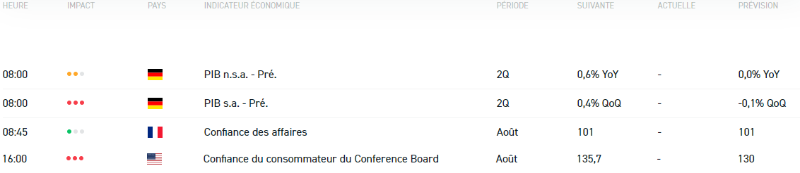 - L’indice de confiance du consommateur américain pour le mois d’août, publié par le Conference Board à 16h00