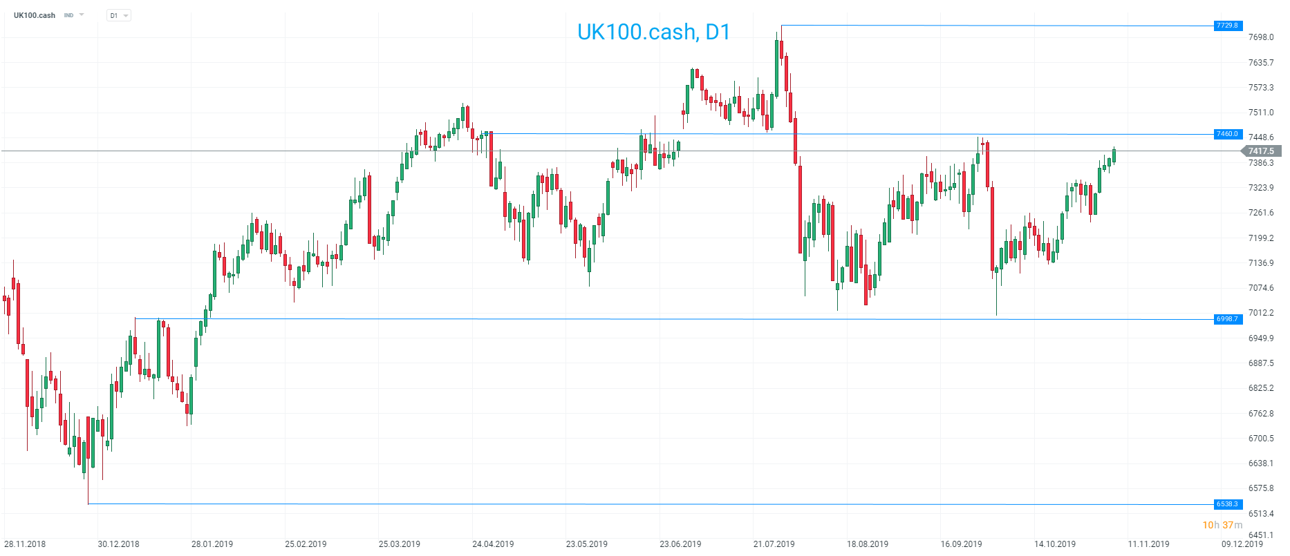 Le FTSE a gagné ce matin après des nouvelles positives sur le front commercial américano-chinois et pourrait recevoir un nouvel élan si la baisse de la livre sterling se concrétisait. 7460 considéré comme le prochain niveau de résistance au swing. Source: xStation