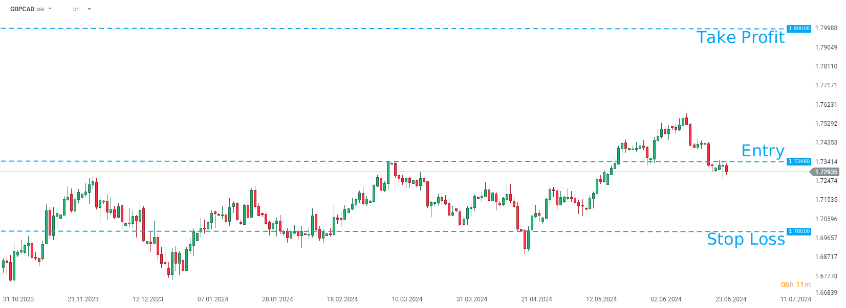 Morgan Stanley suggère de prendre une position longue sur GBPCAD au prix du marché, avec comme objectif 1,8000 et un ordre de stop-loss placé à 1,7000. Source : xStation5