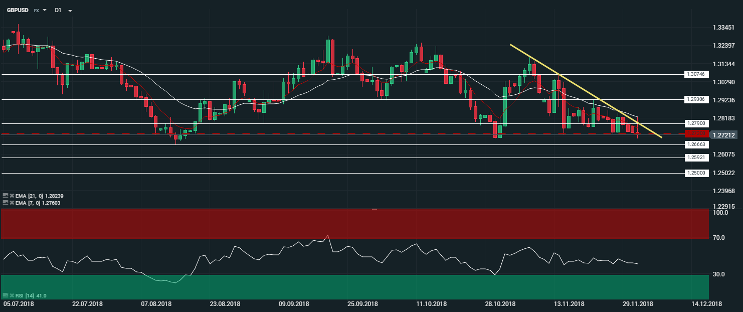 En unité de temps journalière (D1), la paire GBPUSD continue d’évoluer à la baisse toujours au sein du triangle descendant identifié depuis le 15 novembre. Les cours sont capés par les moyennes mobiles à 7 et 21 périodes. Le RSI est orienté à la baisse et oscille à 40,5 points. Dans ce contexte, nous avons un biais baissier sur la paire GBPUSD avec comme objectif le niveau des 1,2666 $ - et par extension le niveau des 1,2590 $.