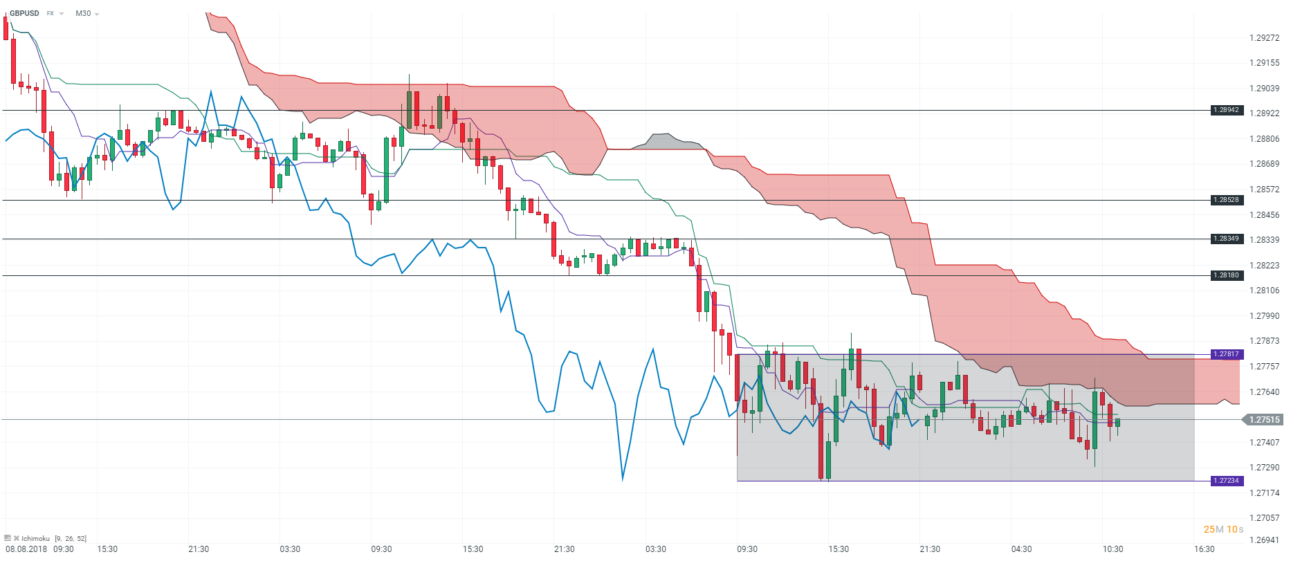 Au Royaume-Uni, le produit intérieur brut (PIB) a progressé de 0,4 % au deuxième trimestre. Sur un an, l’économie a enregistré une croissance de 1,3 %. Dans le même temps, la production industrielle a augmenté de 1,1 % et la production manufacturière est en hausse de 1,5 % (en rythme annualisé) au mois de juin. D’un point de vue technique, la paire GBPUSD évolue en tendance baissière en unité de temps 30 minutes (M30). En effet, nous observons sur le graphique ci-dessus que les prix sont capés par le nuage Kumo, la Tenkan (courbe mauve) et la Kijun (courbe verte). Dans le même temps, la Lagging-Span (courbe bleue) est orientée à la baisse et fluctue sous les prix. Malgré la tendance, nous notons que les cours consolident dans une fouchette de 58 pips (1,2781 – 1,2723). C’est pourquoi, nous avons un biais acheteur sur la paire et estimons qu’elle pourrait retrouver le niveau de 1,28 $ pour 1 £ à court terme.