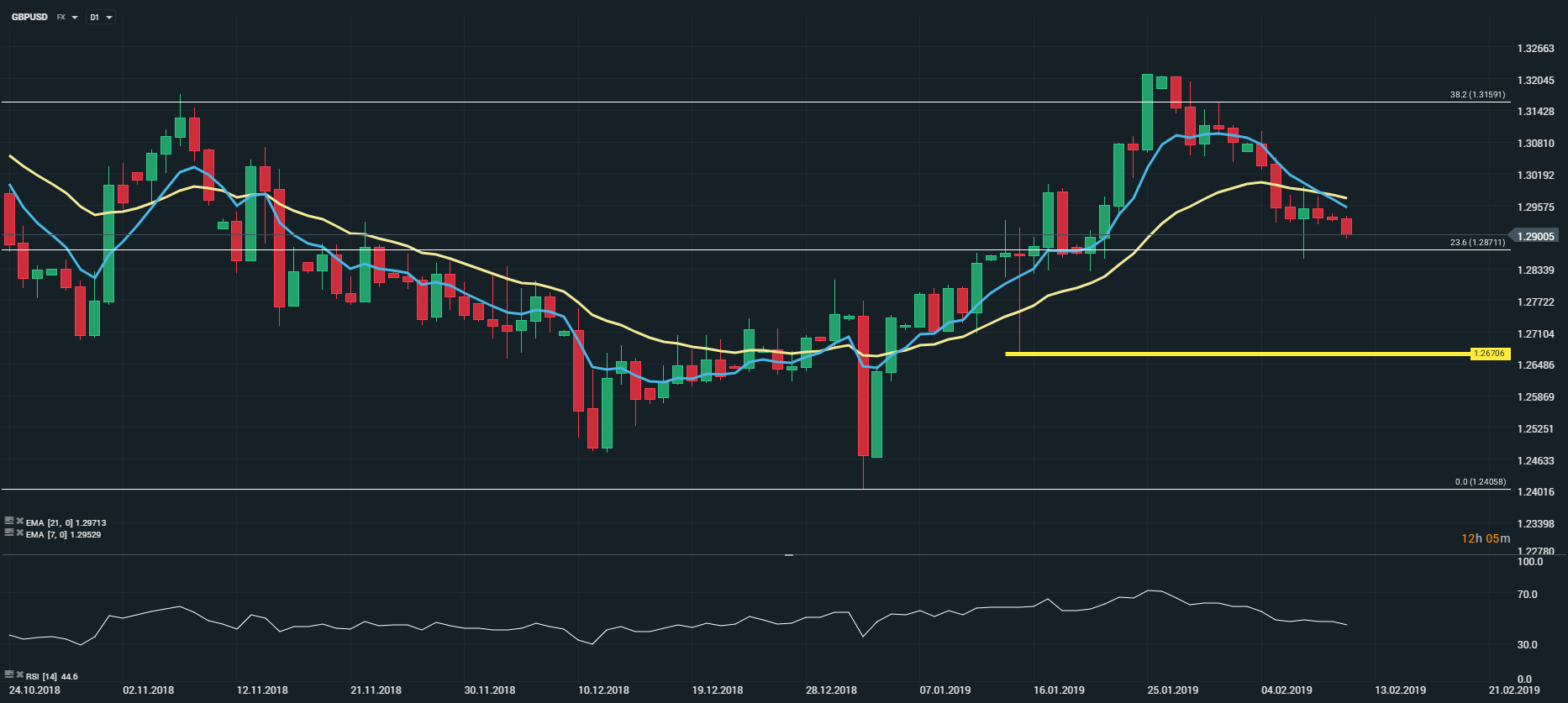 Sur le plan technique, la paire GBPUSD évolue en tendance baissière en unité de temps journalière (D1). En effet, nous observons sur le graphique ci-dessus que les prix sont capés par les moyennes mobiles à 7 et 21 périodes depuis quelques jours. De plus, le RSI est orienté à la baisse et oscille sous sa zone de neutralité, autour des 44,6. Dans un tel contexte, nous avons un biais vendeur sur la paire GBPUSD. En revanche, le scénario baissier pourrait s'invalider en cas de rebond technique significatif (au-dessus des moyennes mobiles à 7 et 21 périodes - niveau des 1,2952 $ pour 1 £).
