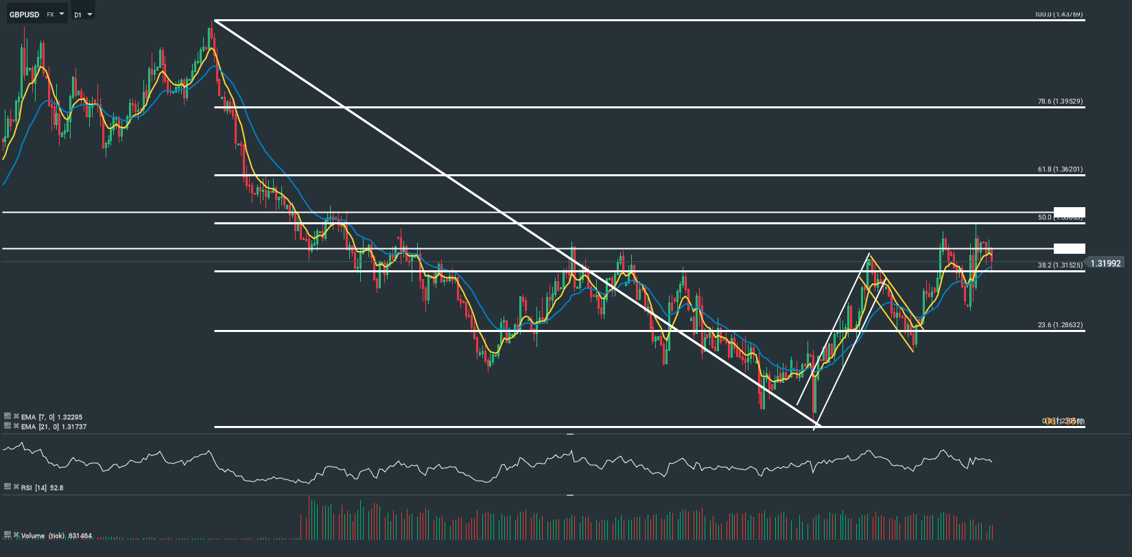 Sur le plan technique, en horizon temporel journalier (D1), le « câble » évolue à la baisse. Les cours ont franchi à la baisse la moyenne mobile à 7 périodes. Toutefois, les cours sont soutenus par une zone de support comprenant la moyenne mobile à 21 périodes et le seuil des 38,2 % des retracements de Fibonacci (1,3115$ pour 1 £). Nous avons un biais haussier sur l’indice, à court terme.
