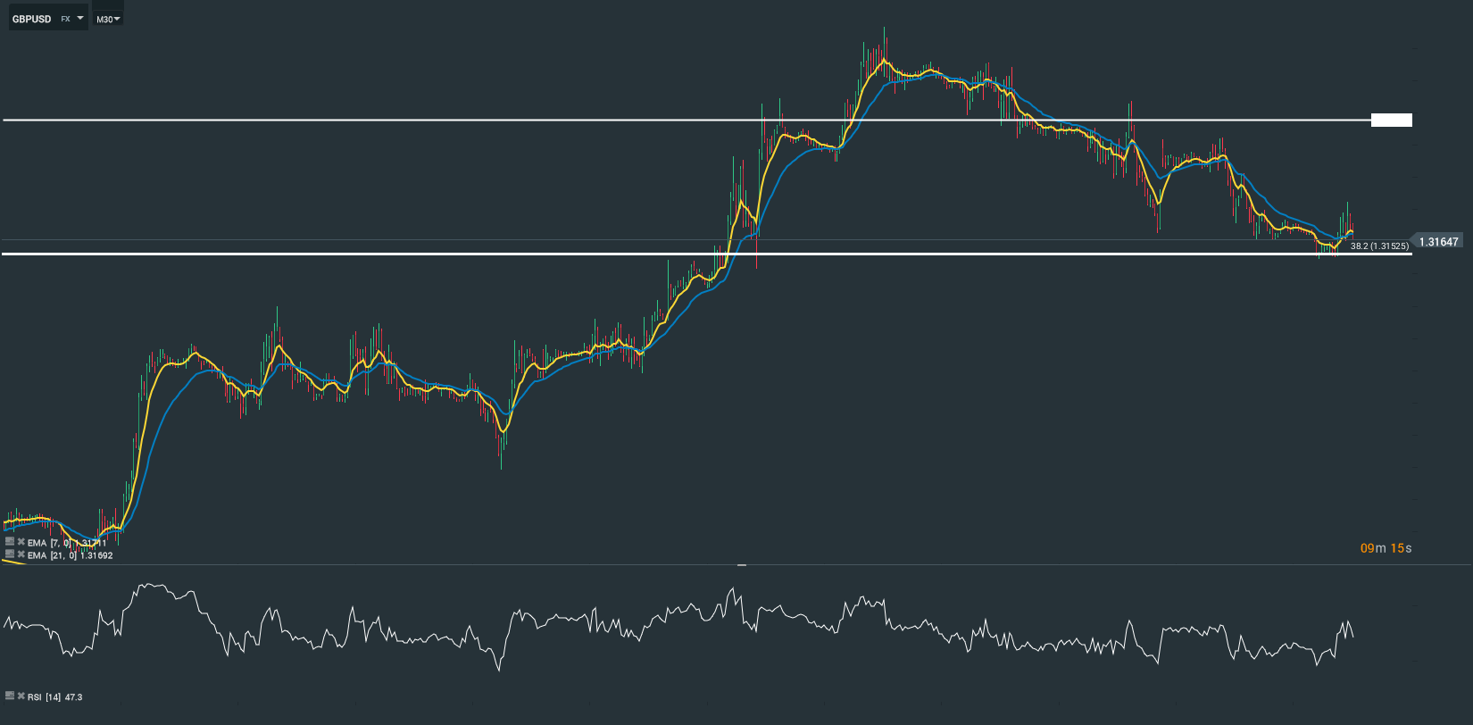 Sur le plan technique, en horizon temporel « M30 » (trente minutes), le GBPUSD est orienté à la hausse et fluctue autour des 1,3164 $ pour 1 £. Les cours sont soutenus le seuil des 1,3152 $, correspondant au 38,2% des retracements de Fibonacci. De plus, la paire est soutenue par les moyennes mobiles de court terme à 7 et 21 périodes. Nous avion un biais haussier sur la paire.