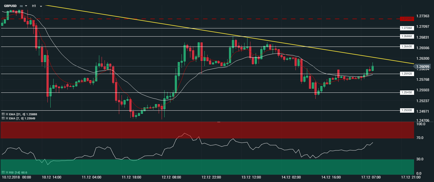 En unité de temps horaire (H1), la paire GBPUSD évolue en tendance baissière. Les cours sont portés par les moyennes mobiles à 7 et 21 périodes. Le RSI est orienté à la hausse proche de sa zone de « sur achat » et oscille à 62,7 points. Dans ce contexte, nous serons baissiers sur la paire GBPUSD, avec pour objectif le niveau des 1,2545 $.