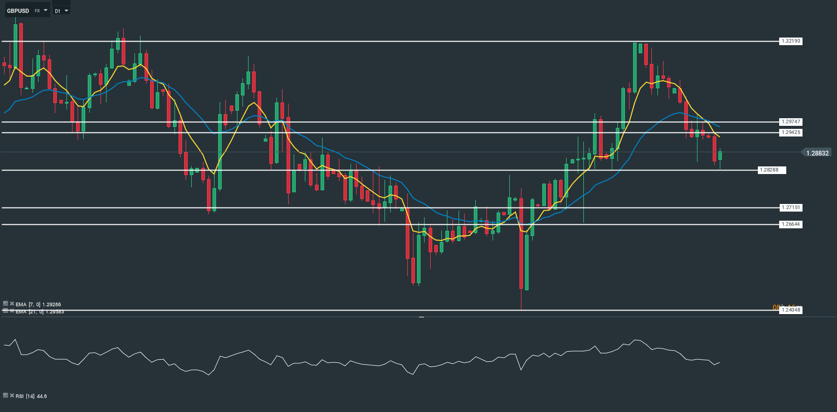 En unité de temps journalière (D1), la paire GBPUSD évolue à la hausse. Le « sterling » (la livre) bondi sur un support technique important (le niveau des 1,2828 $). Le RSI est orienté à la baisse en dehors de sa zone de neutralité (44,6). Il est probable qu’à court terme le mouvement haussier se poursuive jusqu’au 1,2942 $ la livre. En revanche, nous repasserons baissiers sur la paire en cas de franchissement des 1,2828 $.