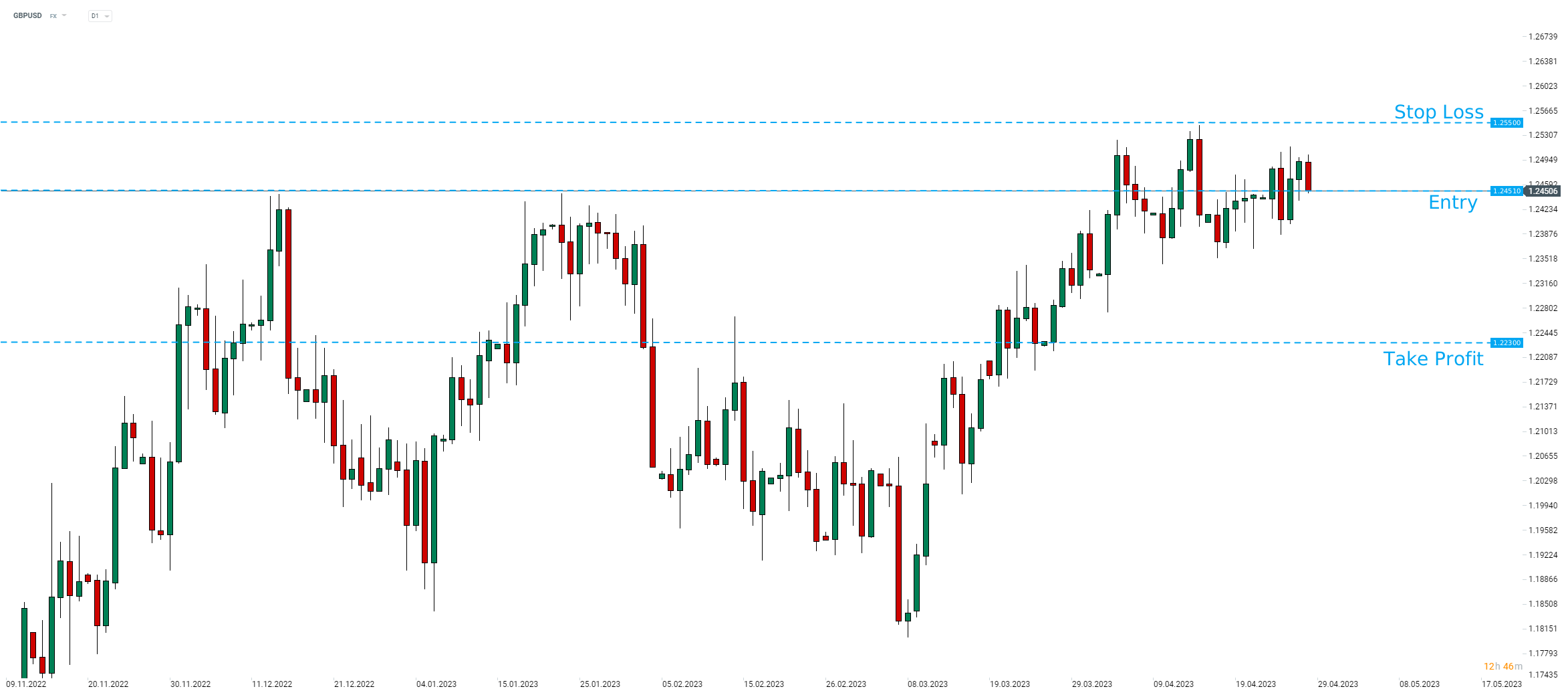 Bank of America recommande de prendre une position à la vente sur GBPUSD au prix du marché avec un objectif de 1,2230 et un ordre stop loss placé à 1,2550. Source : xStation5