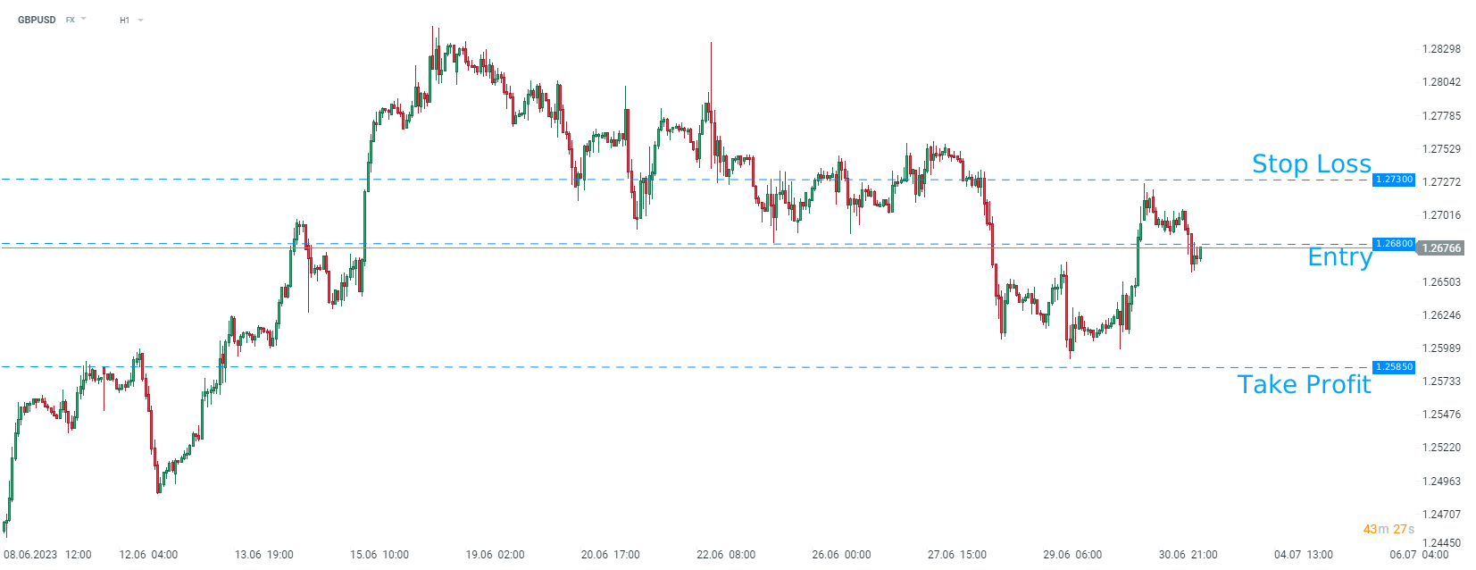 IFR recommande de prendre une position courte sur GBPUSD au prix du marché avec un objectif de 1,2585 et un ordre de stop loss placé à 1,2730. Source : xStation5.