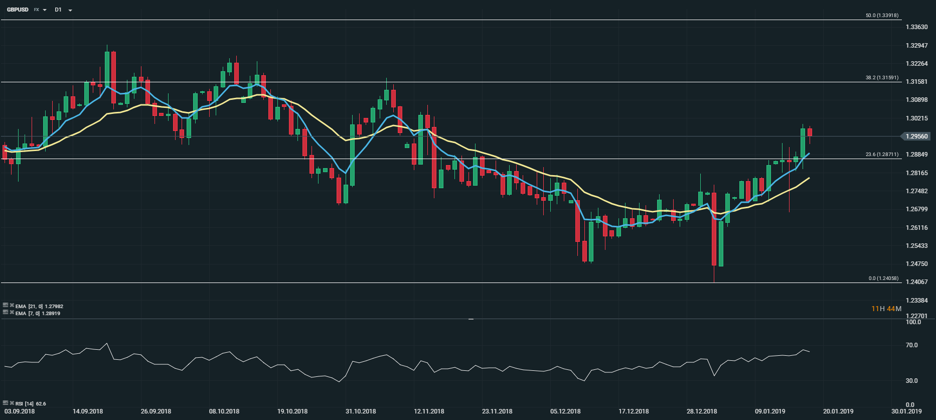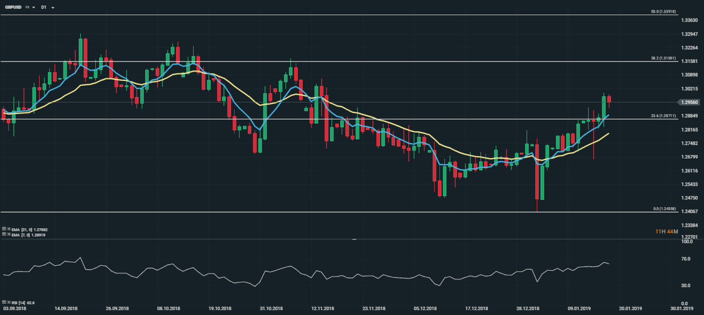 Au Royaume-Uni, les ventes au détail ont reculé de 0,9 % au titre du mois de décembre. Néanmoins, sur un an elles progressent de 3 %. Malgré les récents événements associés au Brexit, la paire GBPUSD gagne 0,78 % depuis le début de la semaine. Sur le plan technique, la toile de fond est relativement positive depuis plusieurs jours. Et pour cause, nous observons sur le graphique ci-dessus que les prix sont portés par les moyennes mobiles à 7 et 21 périodes en unité de temps journalière (D1). Concernant le RSI, l’oscillateur est haussier et se rapproche progressivement de sa zone de surachat. En somme, les différents indicateurs techniques nous laissent penser que la paire pourrait gagner du terrain à court terme et que les prix devraient retrouver le niveau des 1,3159 $, soit le niveau des 50 % des retracements de Fibonacci.