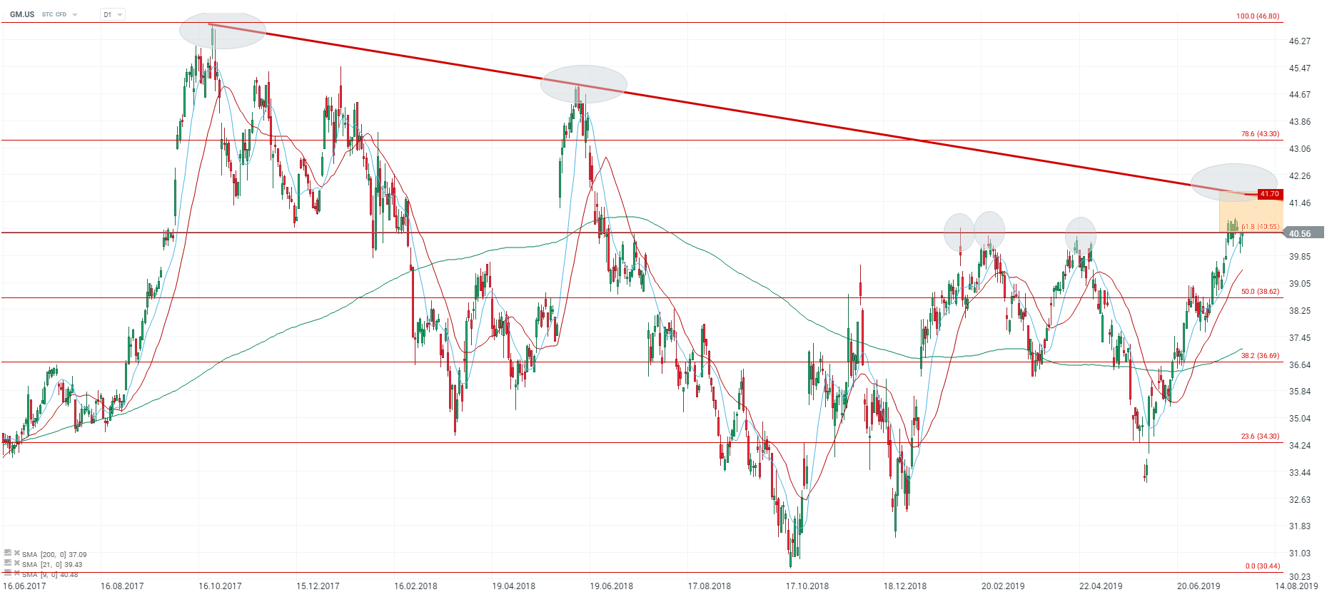 Les cours de l’action General Motors testent actuellement une zone de résistance majeure formée par les 61.8 % des retracements de Fibonacci autour de la zone des 40.55 $. Depuis le début de l’année 2019 les cours ont testé ce niveau à 3 reprises sans succès. En cas de franchissement de cette résistance, une nouvelle résistance majeure de long terme autour des 41.70 $ devra être franchie afin de confirmer l’élan haussier. Source : xStation5.