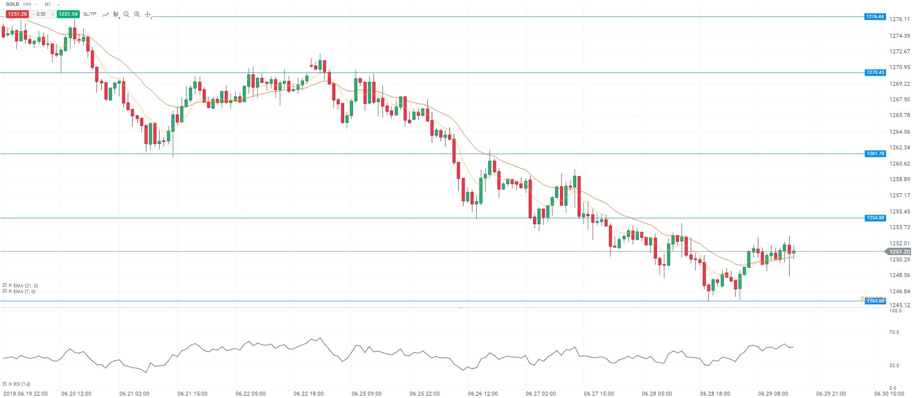 Le département américain au Commerce a publié l’indice des prix à la consommation des ménages du mois de mai aux Etats-Unis. L’indice des prix PCE core a progressé de 2% en rythme annuel sur cette période, contre une hausse de 1,8% attendue. Pour rappel, cet indicateur est très suivi par la Réserve fédérale (Fed) et a donc atteint l’objectif fixé par l’institution. Par ailleurs, les dépenses des ménages américains ont ralenti en mai par rapport à avril. Enfin, l’indice PMI de Chicago du mois de juin s’est amélioré en passant de 62,7 (en mai) à 64,1, signe de la croissance économique dans la région. Concernant l’analyse technique, les prix fluctuent au-dessus de la moyenne mobile courte (à 7 périodes) en unité de temps horaire (H1). Le RSI est orienté à la hausse autour de sa zone de neutralité. Ces éléments nous conduisent à avoir une préférence à l’achat avec pour objectif le niveau des 1 254 dollars l’once.