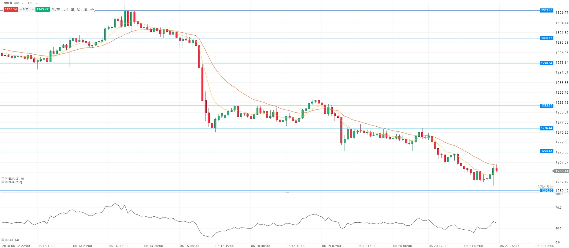 Plusieurs statistiques ont été publiées ce jour du côté des Etats-Unis. Concernant le marché de l’emploi, les inscriptions hebdomadaires au chômage ont reculé de manière inattendue pour la semaine terminée au 16 juin. En effet, le département du Travail fait état de 218 000 inscriptions sur cette période, contre 221 000 attendues. Dans le même temps, on note un repli de l’indice manufacturier de la Réserve fédérale de Philadelphie. L’indicateur est ressorti à 19,9, contre 28,9 en prévision. Cette publication traduit un ralentissement de l’activité économique dans la région au mois de juin. Concernant l’analyse technique, les prix fluctuent autour des moyennes mobiles (à 7 et 21 périodes) en unité de temps horaire (H1). Le RSI est orienté à la hausse autour de sa zone de neutralité. Ces éléments nous conduisent à avoir une préférence à l’achat avec comme objectif le niveau des 1 270$ l’once.