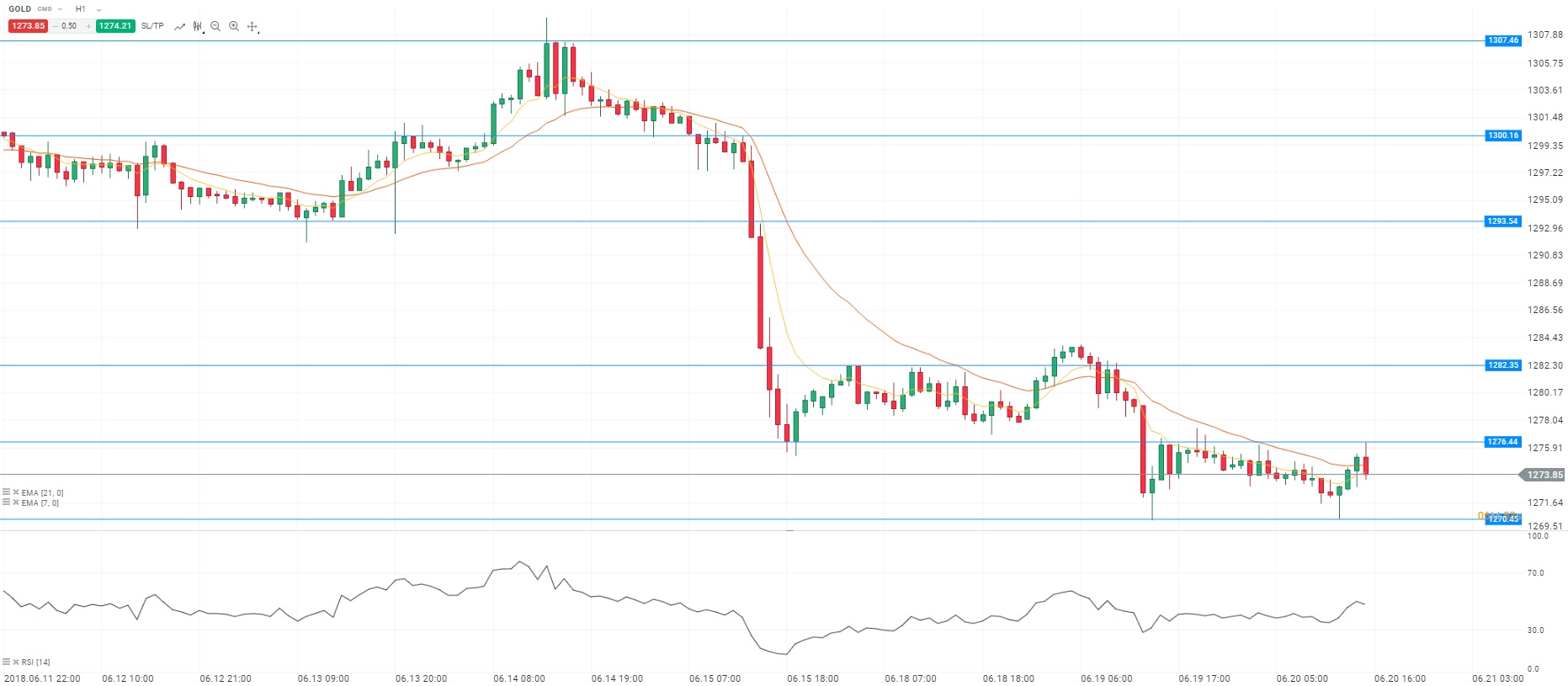 Pour l’heure, l’actif se stabilise sur le niveau des 1 273 dollars l’once. Les Bourses européennes retrouvent des couleurs tandis que les contrats futures américains sont orientés à la hausse. Dans l’attente d’un nouveau rebondissement dans le dossier commercial entre la Chine et les Etats-Unis, les opérateurs semblent revenir sur les actifs "risqués". Cependant, la prudence reste de mise. En effet, le rendement de l’obligation allemande de maturité dix ans repart à la baisse sur le niveau de 0,67%. Sur le marché des changes, la paire EURUSD n’arrive pas à s’affranchir du niveau de 1,16 dollar. La vigueur du dollar pénalise l’or. Enfin, le yen perd du terrain, la monnaie japonaise étant considéré comme une valeur refuge. Sur un plan technique, les prix oscillent autour des moyennes mobiles (à 7 et 21 périodes) en unité de temps horaire (H1). Le RSI est orienté à la hausse vers sa zone de neutralité. Pour conclure, nous avons un biais neutre sur l’actif.