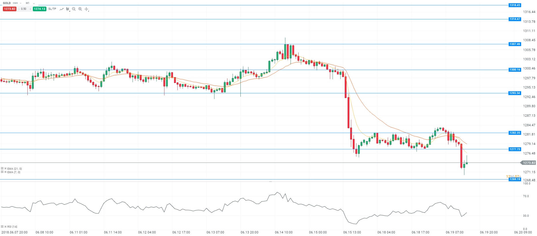 Sur les marchés, les tensions commerciales entre la Chine et les Etats-Unis orientent les investisseurs vers les valeurs refuges comme l’or. Par ailleurs, le rebond du yen et la détente des rendements obligataires confirment ce biais. Cependant, la vigueur du dollar sur le marché des changes risque de pénaliser l’actif. De plus, l’intervention de Mario Draghi a provoqué le repli de l’euro. Ce dernier a déclaré que la Banque centrale européenne (BCE) fera preuve de prudence avant un prochain relèvement des taux en raison des incertitudes sur le plan commercial notamment. Enfin, l’inflation en zone euro est toujours inférieure à la cible de 2%. D’un point de vue technique, les prix évoluent sous les moyennes mobiles (à 7 et 21 périodes) en unité de temps horaire (H1). Le RSI est orienté à la hausse vers sa zone de neutralité. En conclusion, nous avons un biais acheteur avec comme objectif le niveau des 1 277 dollars l’once.