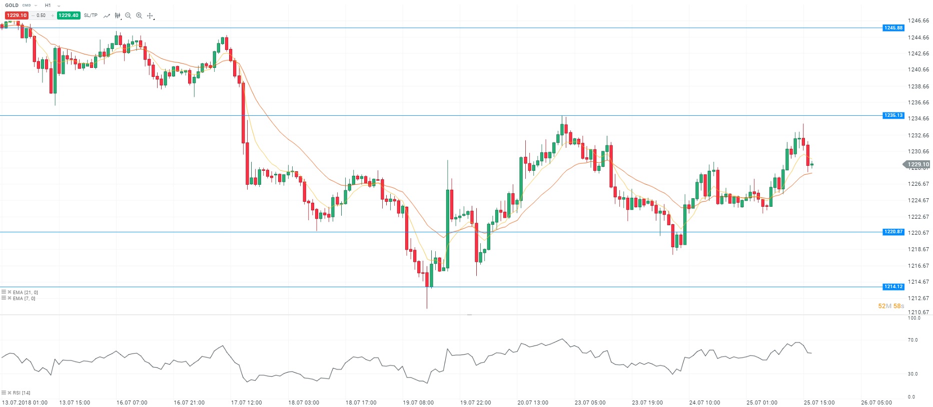 Nous avons pris connaissance du chiffre des ventes de logements neufs du mois de juin aux Etats-Unis. Sur cette période, on note un ralentissement du nombre de logements neufs vendus. Par rapport au mois de mai, les ventes ont reculé de 5,3% avec 631 000 logements vendus, soit la plus forte contraction depuis le début d’année. Sur le marché des changes, la paire EURUSD se replie sous le seuil de 1,17$ pour un euro. Sur le plan commercial, la décision définitive des Etats-Unis à propos des taxes sur les véhicules importés d’Europe est attendue. Concernant l’analyse technique, les prix fluctuent sous la moyenne mobile courte (à 7 périodes) en unité de temps horaire (H1). Le RSI est stable proche de sa zone de surachat. Ces éléments nous conduisent à avoir une préférence la vente avec pour objectif le niveau des 1 220 dollars l’once.