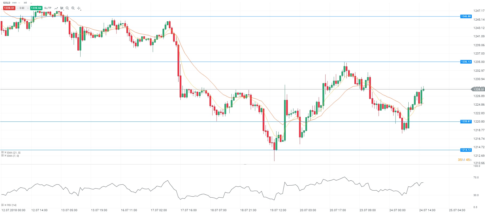 Nous avons pris connaissance des indices PMI du mois de juillet aux Etats-Unis. On constate une accélération de l’activité manufacturière. En effet, l’indicateur est ressorti au-dessus des attentes du consensus à 55,5, contre 55,1 en prévision. Cependant, le secteur des services a ralenti sur cette période. Sur le marché des changes, la paire EURUSD se maintient au-dessus du seuil de 1,17$ pour un euro. Cette tendance favorise les actifs libellés en dollar comme le gold. Pour rappel, la confirmation du relèvement des taux d’intérêt par Jerome Powell, président de la Réserve fédérale (Fed), la semaine dernière, a provoqué la chute de l’actif sur le niveau des 1 211 dollars. D’un point de vue technique, les prix évoluent au-dessus de la moyenne mobile courte (à 7 périodes) en unité de temps horaire (H1). Le RSI est orienté à la hausse autour de sa zone de neutralité. En conclusion, nous avons un biais acheteur avec comme objectif le niveau des 1 235 dollars l’once.