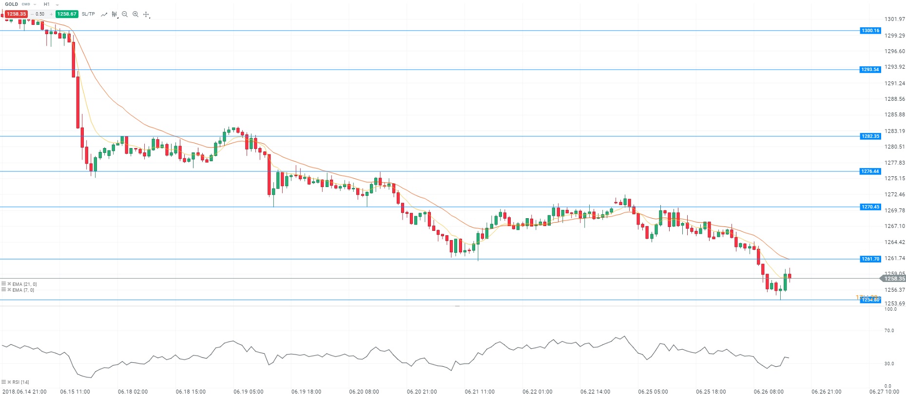 Actuellement, les opérateurs se détournent de l’actif ce qui pénalise les cours. En effet, une enquête de la Commodity Futures Trading Commission (CFTC) fait état d’une faible proportion d’investisseurs ayant un biais haussier sur le Gold. L’actif ne joue pas son rôle de valeur refuge malgré le contexte commercial actuel marqué par le conflit entre les Etats-Unis et ses partenaires commerciaux. Les opérateurs s’orientent vers les obligations d’Etat ou le yen. Dans le même temps, le récent regain du dollar et la remontée des taux obligataires ne favorisent pas l’actif, le Gold n’offrant pas de rendements. Concernant l’analyse technique, les prix oscillent sous la moyenne mobile courte (à 7 périodes) en unité de temps horaire (H1). Le RSI est stable proche de sa zone de survente. Ces éléments nous conduisent à avoir une préférence neutre sur l’actif.