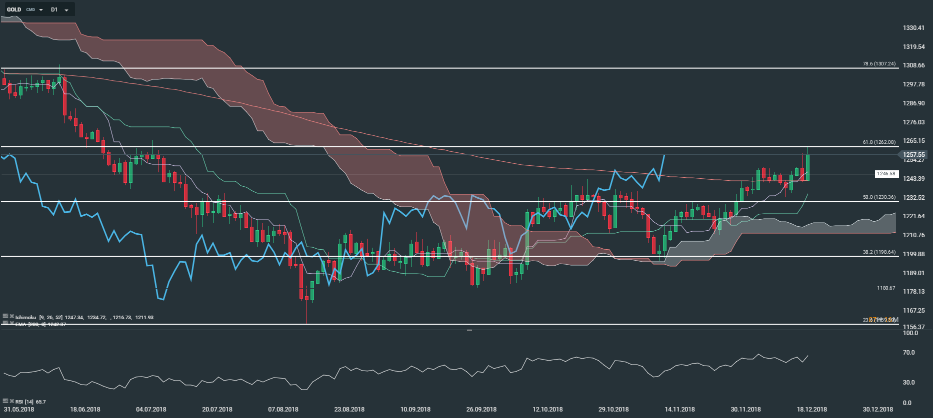 Dans ce contexte, le métal jaune gagne 0,45 % à 1 257,55 dollars l’once. Sur le plan technique, l’or évolue en tendance haussière en unité de temps journalière (D1). En effet, nous observons sur le graphique ci-dessus que les prix sont portés par le nuage Kumo, la Tenkan (courbe mauve) et la Kijun (courbe verte). Par ailleurs, le RSI est orienté à la hausse et fluctue au-dessus de sa zone de neutralité, autour de 62. Bien sûr, nous avons un avis positif sur l’or et pensons qu’il pourrait retrouver le niveau des 1 262 $ l’once à court terme.