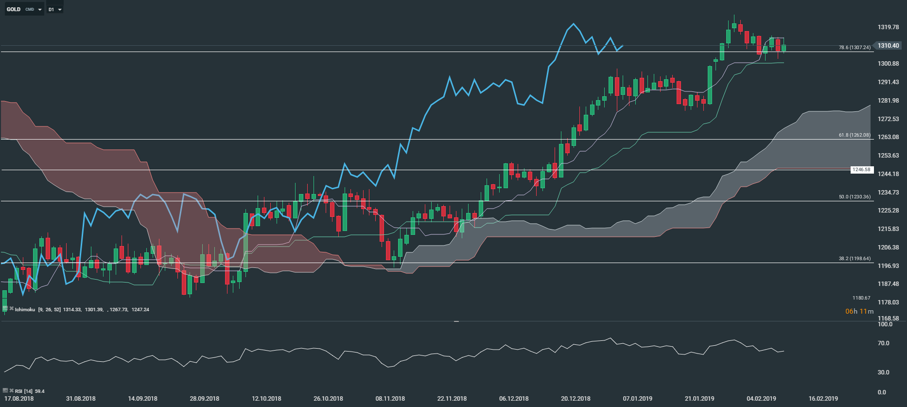 D’un point de vue technique, le métal jaune évolue en tendance haussière en unité de temps journalière (D1). En effet, nous observons sur le graphique ci-dessus que les prix sont soutenus par le nuage Kumo et la Kijun (courbe verte). De plus, la Lagging-Span (courbe bleue) est orientée à la hausse et progresse au-dessus des prix depuis plusieurs semaines. En dépit de cette très bonne toile de fond technique, nous faisons état d’une pression baissière à court terme et notons que la Tenkan (courbe mauve) retient les cotations depuis plusieurs jours. Pour conclure, nous conservons un avis positif sur le métal jaune à moyen et long terme.