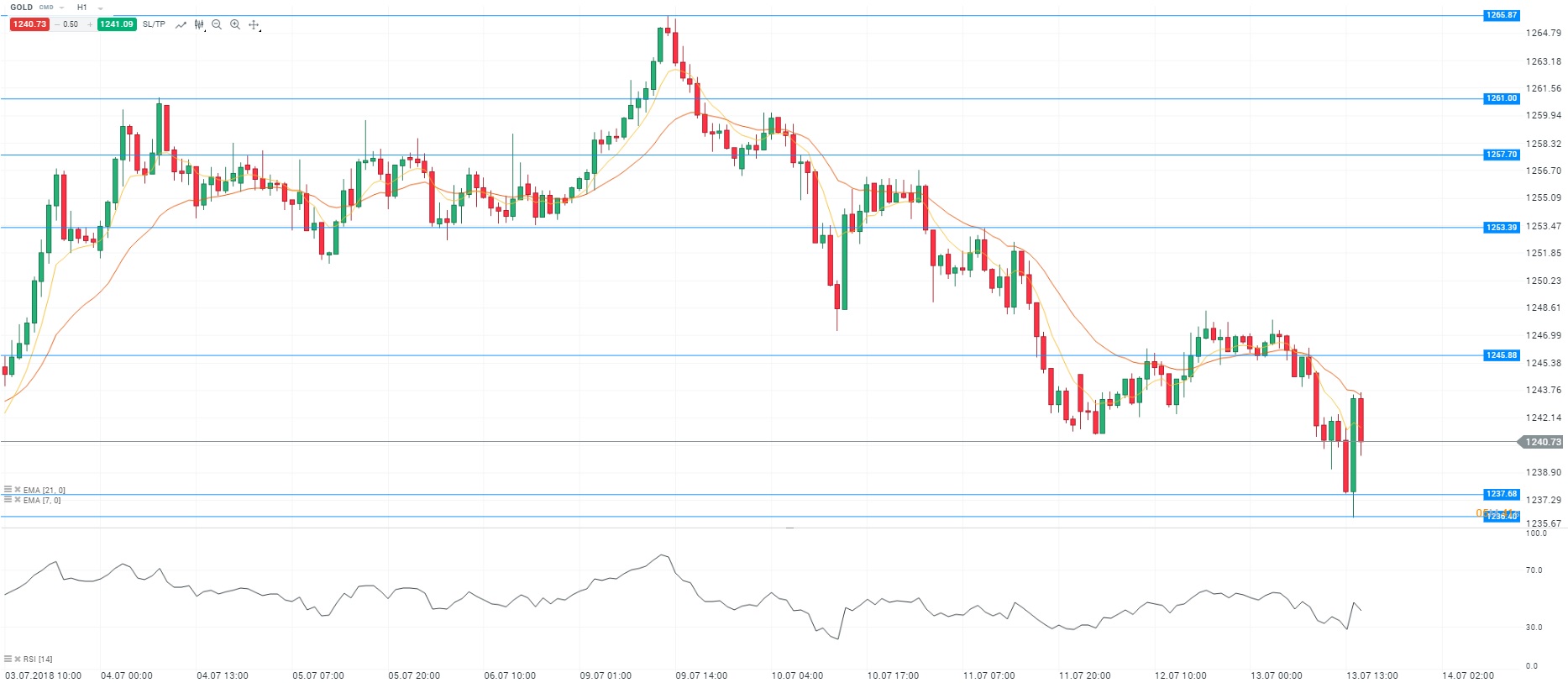 Le renforcement du dollar fait suite aux bonnes statistiques publiées jeudi aux Etats-Unis. En effet, l’indice des prix à la consommation a progressé de 0,1% en rythme mensuel et 2,9% en rythme annuel en juin. Sur le marché de l’emploi, les inscriptions hebdomadaires au chômage ont diminuées à 214 000 inscriptions. Nous avons pris connaissance des indices des prix à l’exportation et à l’importation. En glissement annuel, les prix à l’exportation sont ressortis supérieurs à ceux de l’importation (5,3% contre 4,3%). Nous faisons état de la plus forte baisse des prix à l’importation en plus de deux ans au mois de juin en raison de la baisse des cours du pétrole et du rebond du dollar. D’un point de vue technique, les prix évoluent sous les moyennes mobiles (à 7 et 21 périodes) en unité de temps horaire (H1). Le RSI est orienté à la baisse autour de sa zone de neutralité. En conclusion, nous avons un biais vendeur avec comme objectif le niveau des 1 237 dollars l’once.