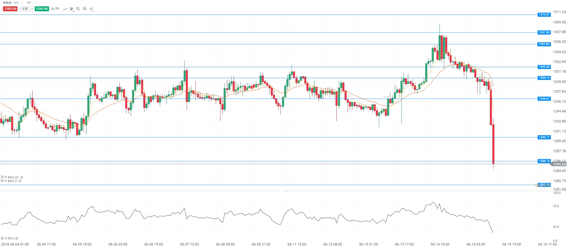 Comme attendu, le président américain, Donald Trump, a dévoilé une liste de 1 102 catégories de produits chinois qui feront l’objet de droits de douane à hauteur de 25%. La valeur des importations chinoises concernées s’élève à 50 milliards de dollars. L’administration américaine souhaite cibler en priorité les produits technologiques. Par ailleurs, Donald Trump a promis des mesures supplémentaires en cas de réplique chinoise. Cette mesure ouvre la voie à une guerre commerciale. Du côté des Etats-Unis, on note un ralentissement de la production industrielle au mois de mai. De même, l’activité manufacturière a fortement ralenti sur cette période. D’un point de vue technique, les prix évoluent sous les moyennes mobiles (à 7 et 21 périodes) en unité de temps horaire (H1). Le RSI est orienté à la baisse dans sa zone de survente. En conclusion, nous avons un biais vendeur avec comme objectif le niveau des 1 282 dollars l’once.