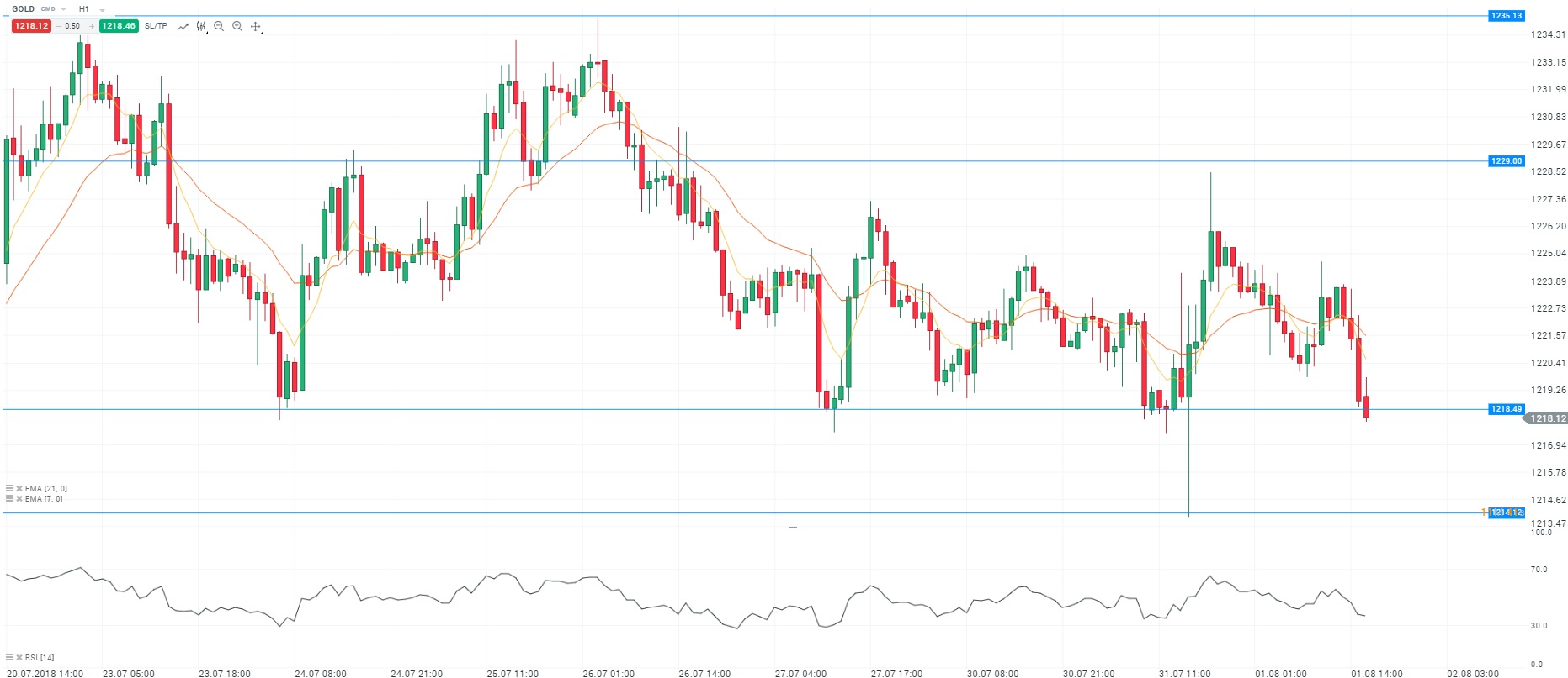 L’indice PMI manufacturier de l’ISM est ressorti inférieur aux attentes du consensus à 58,1 au mois de juillet, contre 60,2 en juin. L’activité manufacturière a donc ralenti sur cette période. Auparavant, le rapport ADP sur les créations d’emplois dans le secteur privé pour le mois de juillet a été publié. Le département du Travail américain a fait état d’une accélération dans les créations d'emplois avec 219 000 nouveaux postes. Sur le front de la politique monétaire, le statu quo est attendu du côté de la Réserve fédérale (Fed). Enfin, le rendement de l’obligation américaine de maturité dix ans a atteint le seuil des 3%, soit un plus haut depuis le mois de mai. D’un point de vue technique, les prix évoluent sous les moyennes mobiles (à 7 et 21 périodes) en unité de temps horaire (H1). Le RSI est orienté à la baisse vers sa zone de survente. En conclusion, nous avons un biais vendeur avec comme objectif le niveau des 1 214 dollars l’once.