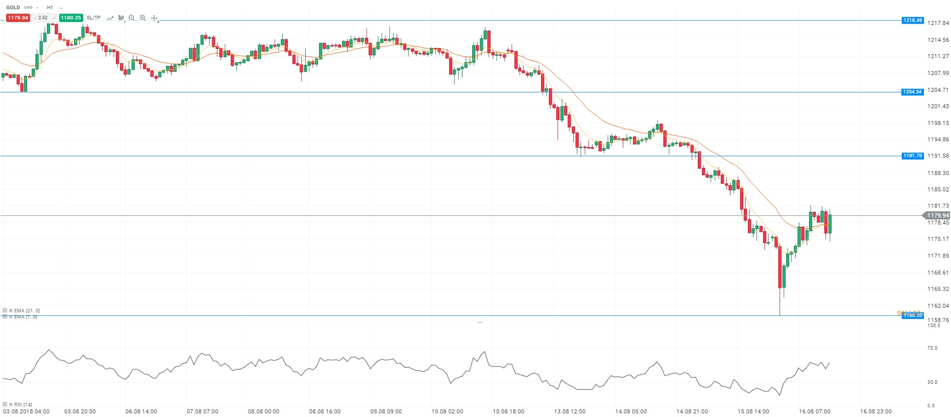 Nous avons pris connaissance de plusieurs statistiques du côté des Etats-Unis. Sur le marché de l’emploi américain, les inscriptions hebdomadaires au chômage ont diminué avec 212 000 demandes contre 215 000 en prévision. Le département du Travail a expliqué cette tendance par la solidité de l’économie américaine et les difficultés à trouver des travailleurs qualifiés. Par ailleurs, l’indice manufacturier de la Réserve fédérale de Philadelphie est au plus bas depuis le mois de novembre 2016 et témoigne du ralentissement de l’activité économique dans la région. Enfin, on constate une hausse de 0,9% des mises en chantier en juillet sur fond de relèvement des taux d’intérêt. Sur un plan technique, les prix évoluent au-dessus des moyennes mobiles (à 7 et 21 périodes) en unité de temps horaire (H1). Le RSI est orienté à la hausse autour de sa zone de neutralité. Pour conclure, nous sommes acheteurs avec comme objectif le niveau des 1 191 dollars l’once.
