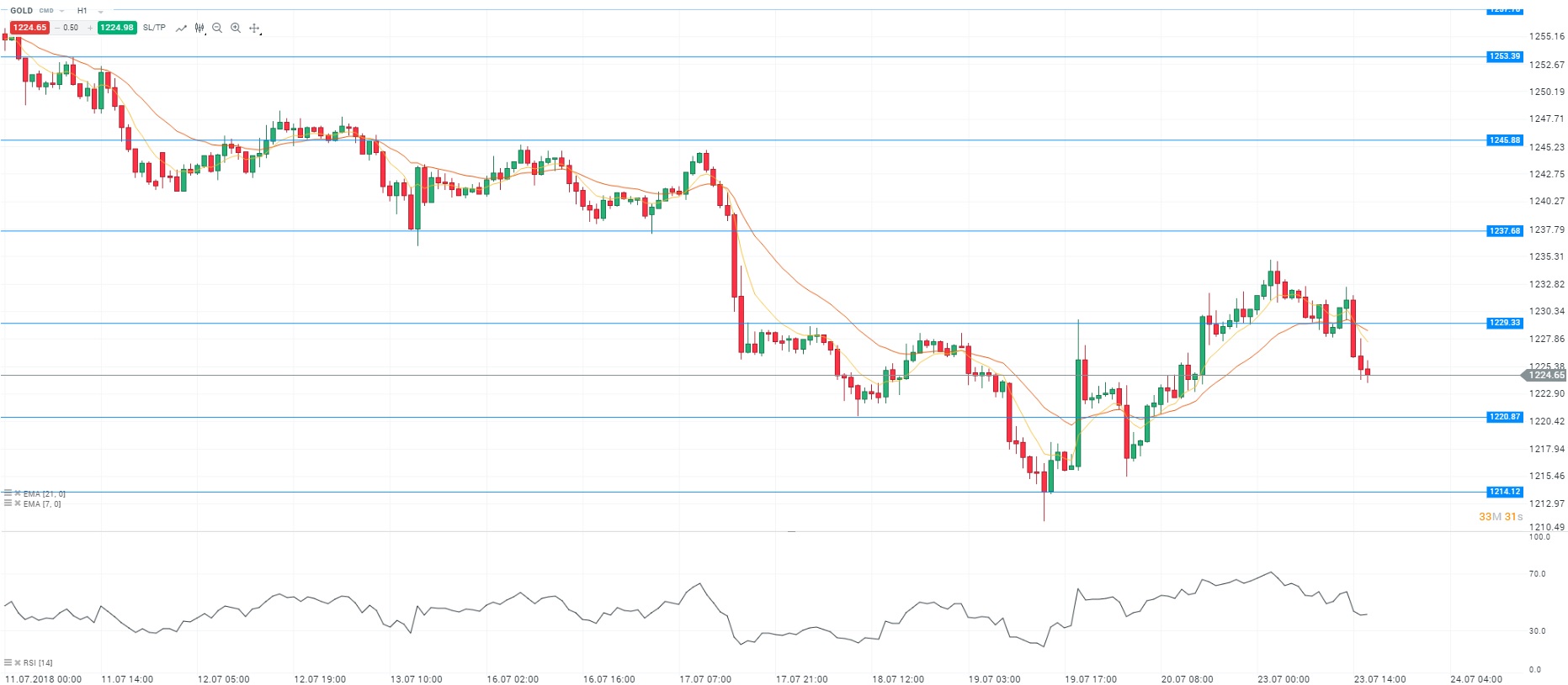 Nous avons pris connaissance des chiffres des ventes de logements existants en juin aux Etats-Unis. On constate une diminution du nombre des ventes sur cette période. En rythme mensuel, les ventes d’immobilier ancien ont ralenti de 0,6%. Dans le même temps, l’indice de confiance du consommateur en zone euro s’est stabilisé à -0,6 pour le mois de juillet en données préliminaires. Sur le marché des changes, la paire EURUSD stagne au niveau de 1,17$. L’affaiblissement du dollar après les critiques de Donald Trump sur la devise américaine et la politique monétaire de la Réserve fédérale (Fed) a participé au rebond de l’actif. Concernant l’analyse technique, les prix fluctuent sous les moyennes mobiles (à 7 et 21 périodes) en unité de temps horaire (H1). Le RSI est orienté à la baisse autour de sa zone de neutralité. Ces éléments nous conduisent à avoir une préférence à la vente avec pour objectif le niveau des 1 220 dollars l’once.