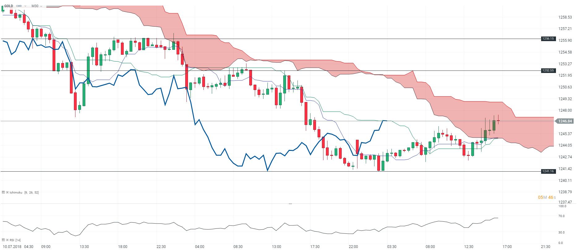 Aux Etats-Unis, l’indice des prix à la consommation a progressé de 0,1 % au mois de juin et de 2,9 % en rythme annualisé. Dans le même temps, les inscriptions hebdomadaires au chômage se sont contractées de 18 000 à 214 000 inscriptions. Concernant les prix à la production, ils ont augmenté de 0,3 % au mois de juin et de 3,4 % sur un an. Au moment où nous écrivons ces lignes, le Gold accuse un repli de 0,03 % à 1 246,84 $ l’once. Au regard du critère Ichimoku, la toile de fond est neutre en M30 car les cours fluctuent à l’intérieur du nuage Kumo. Toutefois, nous faisons état de fortes velléités haussières sur l’actif car les prix sont soutenus par la Tenkan (courbe mauve) et Kijun (courbe verte). En outre, la Lagging-Span (courbe bleue) est orientée à la hausse et évolue au-dessus des prix. Pour conclure, nous avons un biais acheteur sur le métal jaune et pensons qu’il devrait retrouver le niveau des 1 252 $ l’once à court terme.
