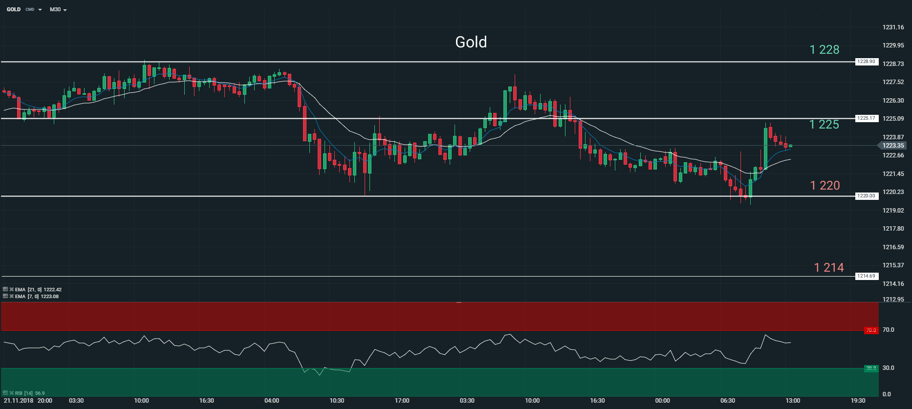 Outre les discours des membres de la Réserve fédérale (Fed), nous nous intéresserons ce mardi à l’indice S&P Case Shiller des prix de l’immobilier du mois de septembre aux Etats-Unis et l’indice de confiance des consommateurs américains au titre du mois de novembre, selon le Conference Board. Malgré le repli de la paire EURUSD, le métal jaune se montre résilient autour des 1 224 $ l’once. Sur le plan technique, la toile de fond est globalement baissière en unité de temps 30 minutes (M30). En effet, nous observons sur le graphique ci-dessus que les prix sont portés par les moyennes mobiles à 7 et 21 périodes. En outre, le RSI évolue au-dessus de sa zone de neutralité, autour des 56,9. Dans ce contexte, nous conservons un biais acheteur sur l’actif et pensons qu’il retrouvera le niveau des 1 228 à 1 230 $ l’once à court terme.