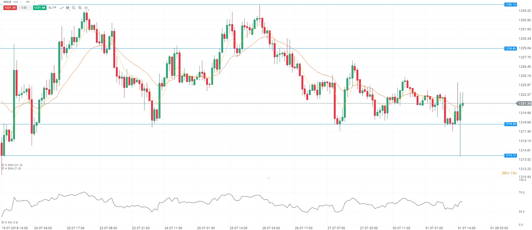 Comme anticipé par le consensus, les prix de l’immobilier ont augmenté de 6,5% en mai, contre 6,7% en avril, selon l’enquête S&P CoreLogic Case-Shiller. Par ailleurs, l’indice PMI de Chicago est ressorti en hausse à 65,5 en juillet après 64,1 en juin. Dans le même temps, l’indice de confiance des consommateurs du Conference Board a progressé et s’établit à 127,4 au mois de juillet, soit une progression par rapport au mois précédent. Pour l’heure, la paire EURUSD est orienté à la baisse vers le seuil de 1,17 dollar pour un euro. D’un point de vue technique, les prix évoluent au-dessus des moyennes mobiles (à 7 et 21 périodes) en unité de temps horaire (H1). Le RSI est orienté à la hausse autour de sa zone de neutralité. En conclusion, nous avons un biais acheteur avec comme objectif le niveau des 1 229 dollars l’once.