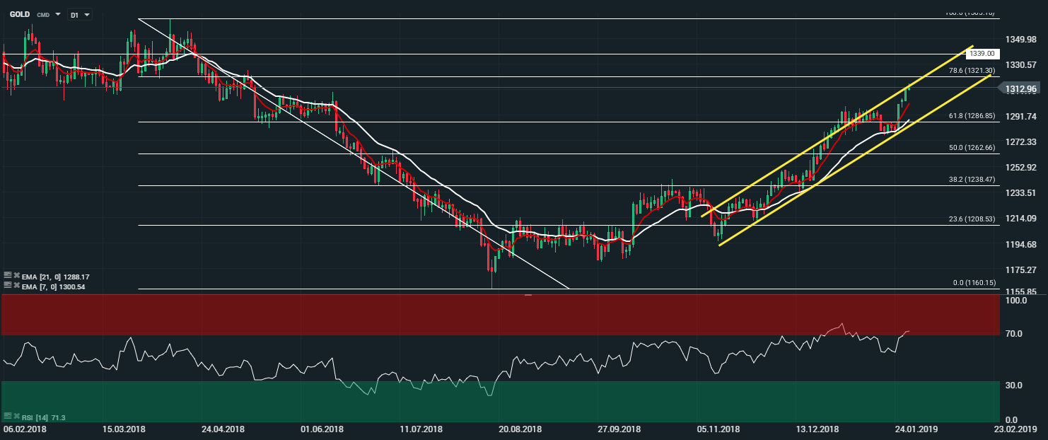 En unité de temps journalière (D1), le GOLD évolue en tendance haussière au sein de son canal haussier. Les cours sont soutenus par les moyennes mobiles à 7 et 21 périodes. Le RSI est orienté à la hausse au sein de sa zone dite de « sur achat » et oscille à 70.7 points. Dans ce contexte, nous attendons que l’actif corrige afin de nous positionner. Aussi il convient d’attendre l’opportunité d’achat sur le niveau des 1 286 $ (correspondant aux 61.8% des retracements de Fibonacci) en direction des 1 321 $ (correspondant aux 78.6% des retracements de Fibonnaci).