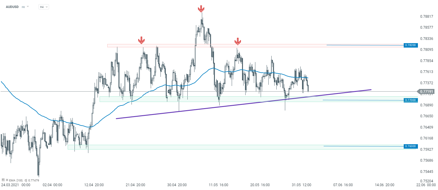 En regardant la paire AUDUSD sur l'intervalle H4, on peut constater que la paire a évolué dans une zone de consolidation récemment. Cependant, selon les classiques de l'analyse technique, une formation en épaule tête épaule s'est formée. En cas de cassure sous la ligne de cou de la formation (zone proche de 0,77), le mouvement de baisse pourrait s'accélérer. D'autre part, la défense du support à 0,77 pourrait conduire à une reprise du mouvement à la hausse. Dans un tel scénario, la cible potentielle la plus proche pour les acheteurs sera la résistance de 0,7820 qui est marquée par les réactions précédentes des cours. Il faut savoir que le marché pourrait devenir plus volatile après la publication des données américaines clés (rapport ADP) à 14h15.
