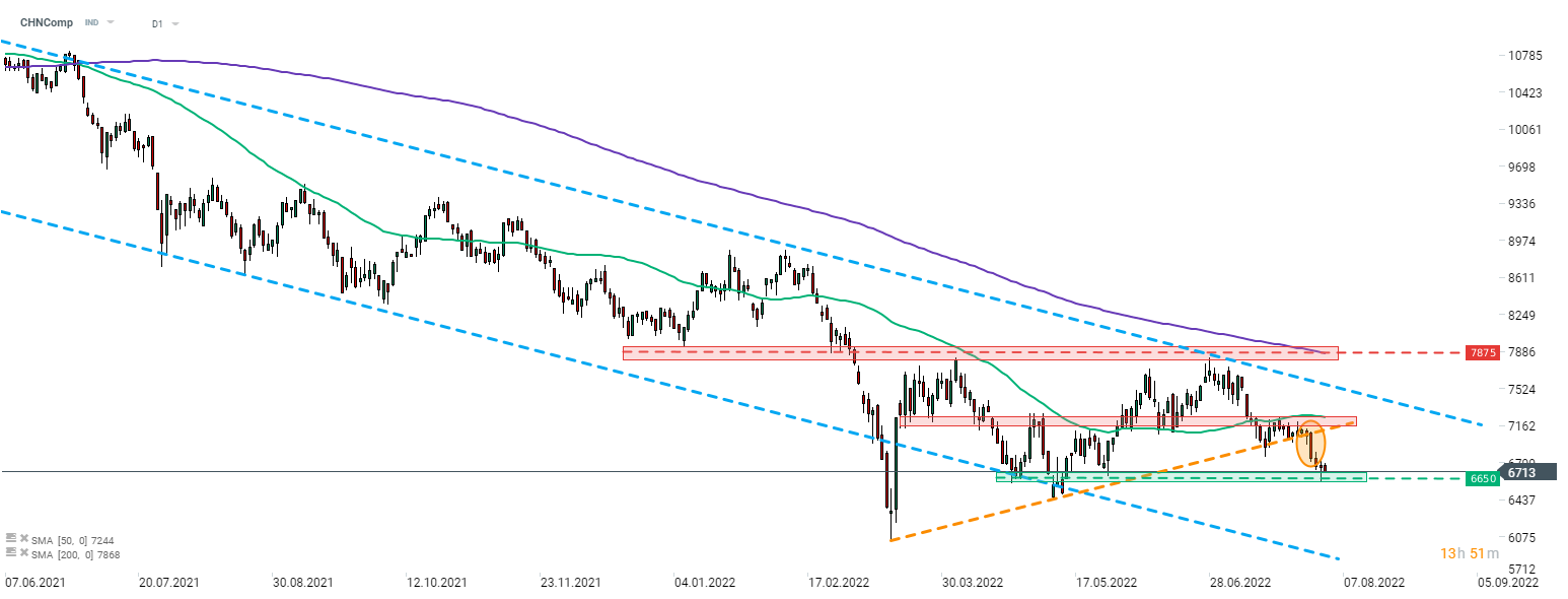 Les actions chinoises pourraient rester sous pression tant que la situation autour de Taïwan restera tendue et incertaine. Bien sûr, l'affaiblissement de l'économie chinoise et les problèmes du secteur immobilier national jouent également un rôle, et sont en fait les principales raisons du mouvement à la baisse d'une année sur le CHNComp, mais l'accélération récente est liée à la visite de Pelosi et à un risque d'escalade. dans les relations sino-américaines.
